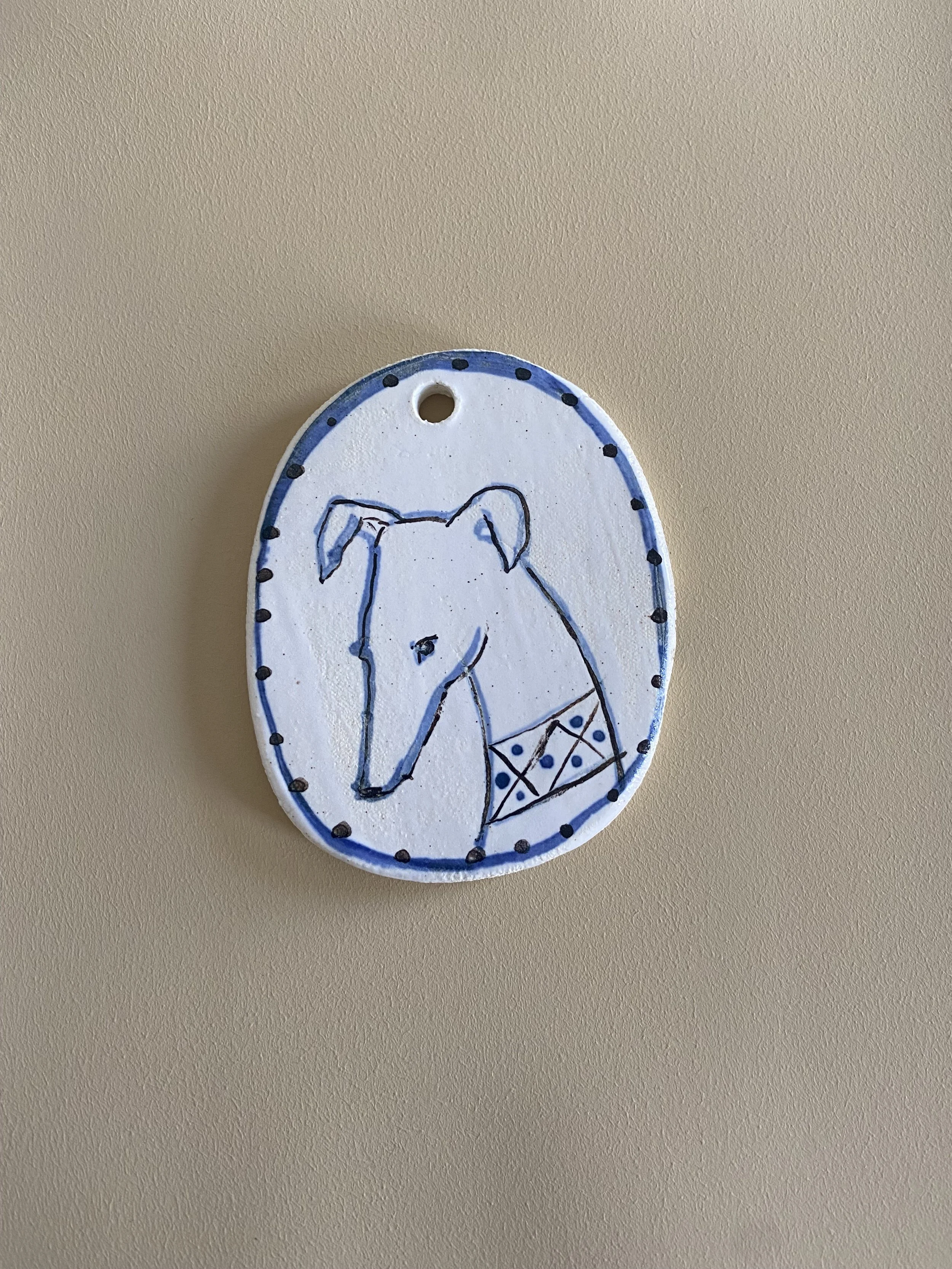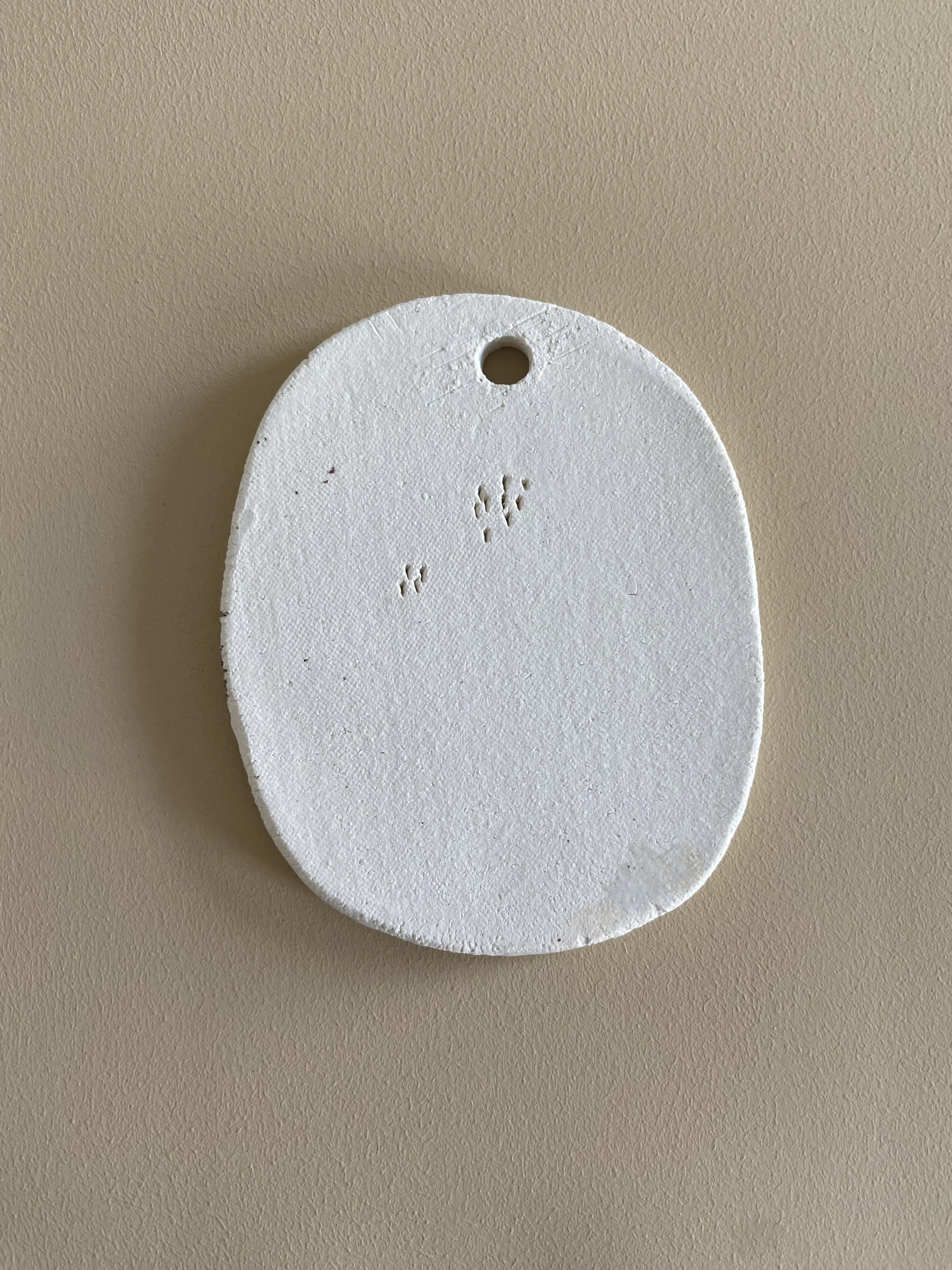 A set of 2 x ceramic decorations, handmade from stoneware clay. Decorated by hand with slip, glaze and oxides.