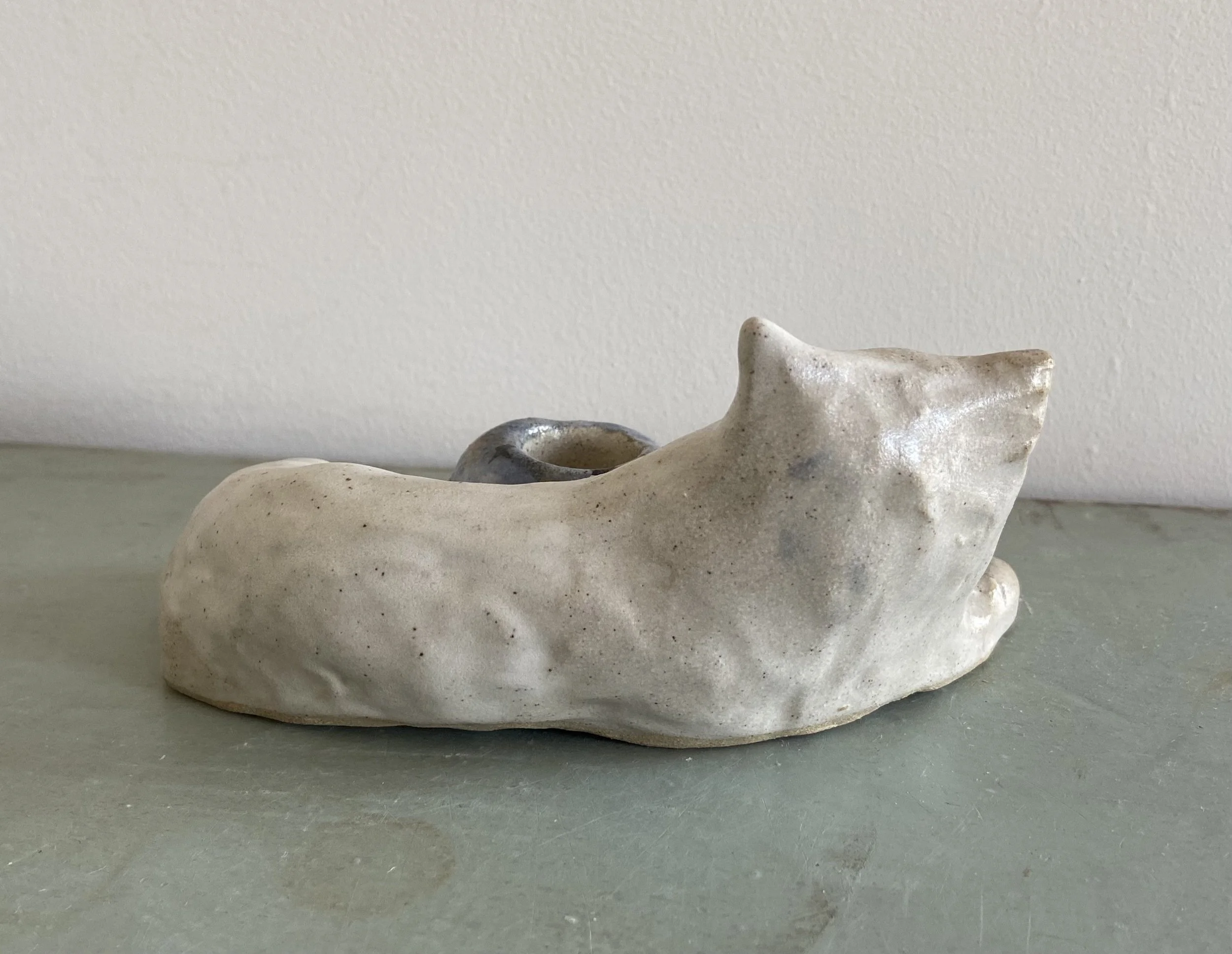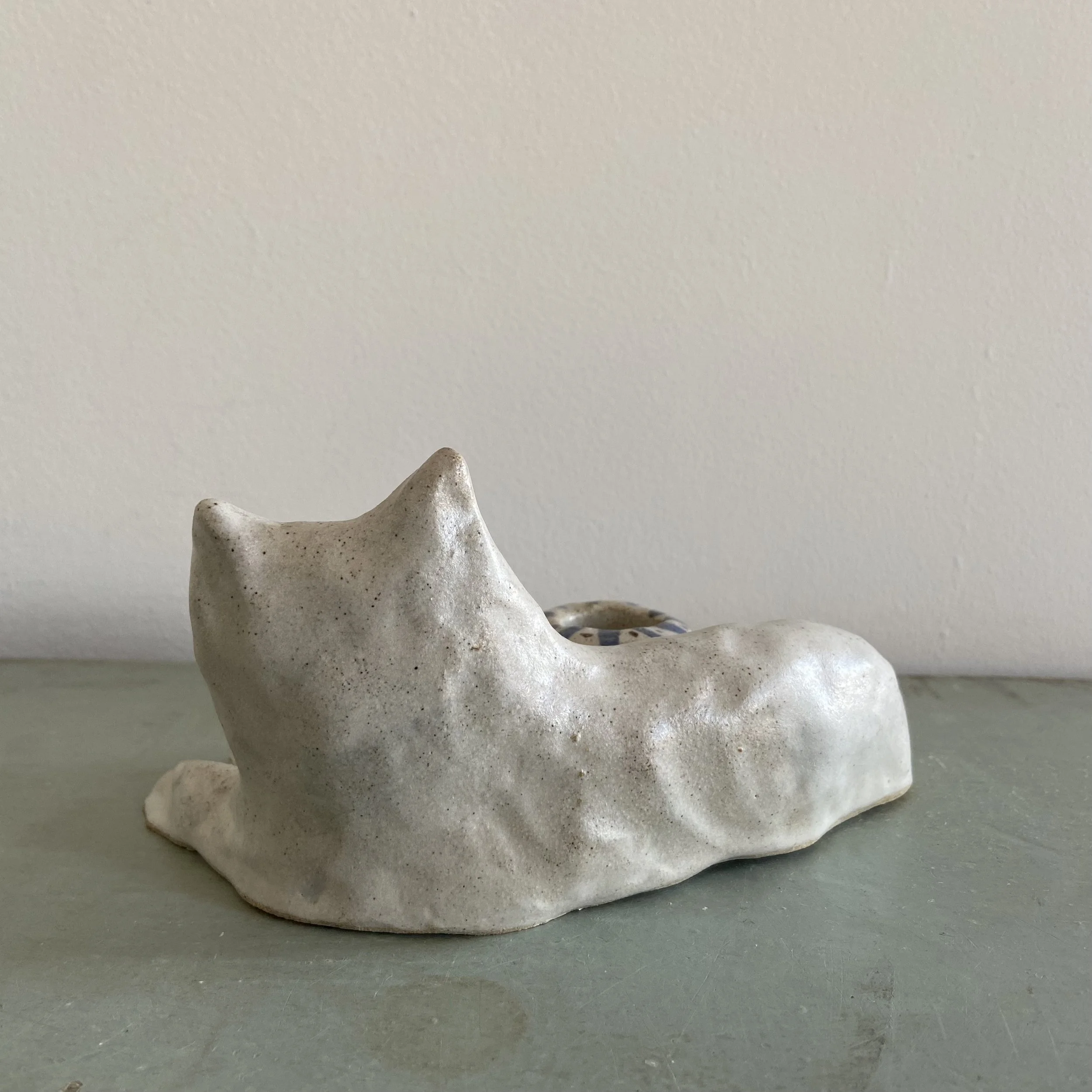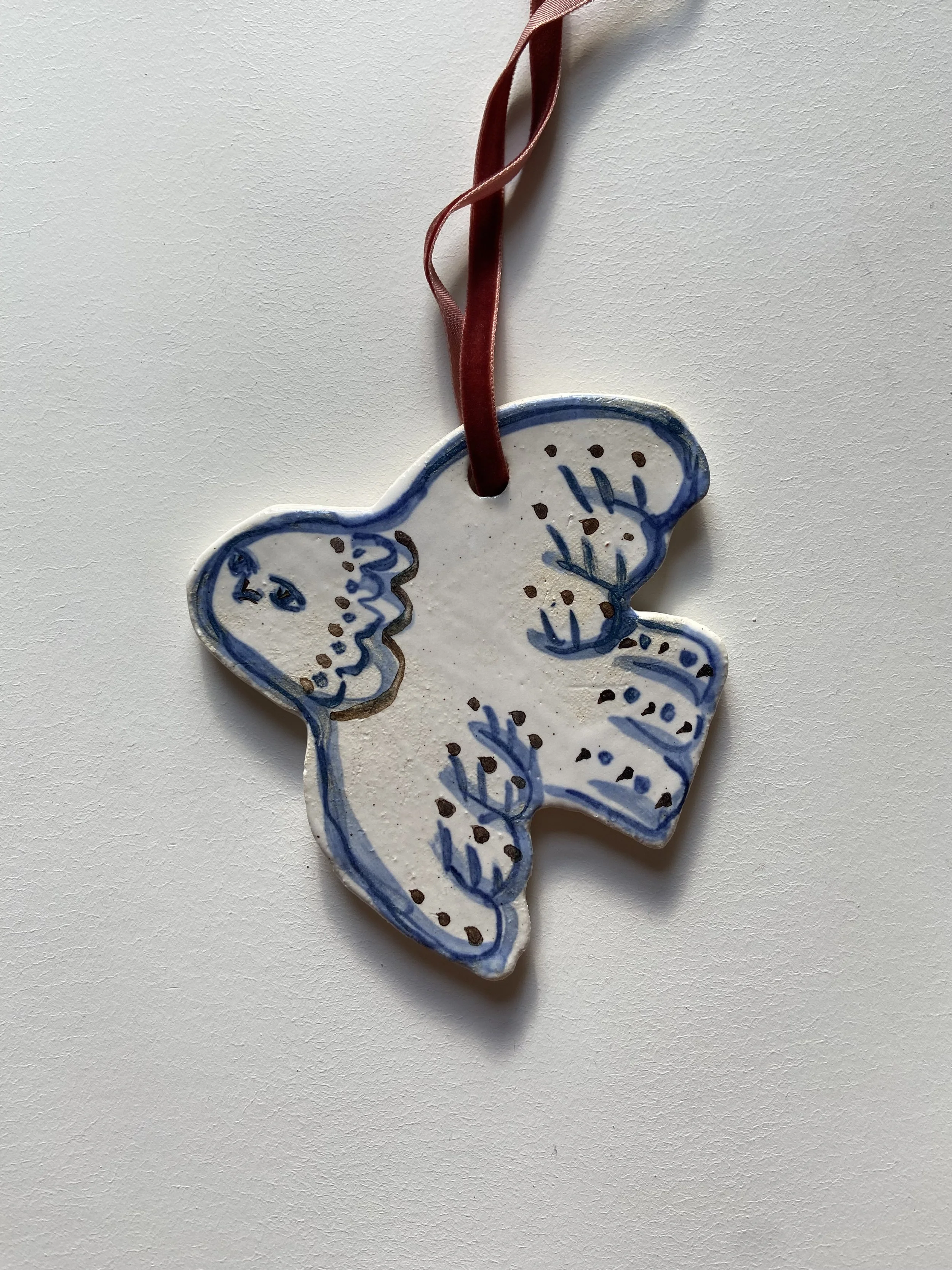 A hand rolled and cut bird decoration, made from white stoneware. Decorated with glossy white glaze and oxides.