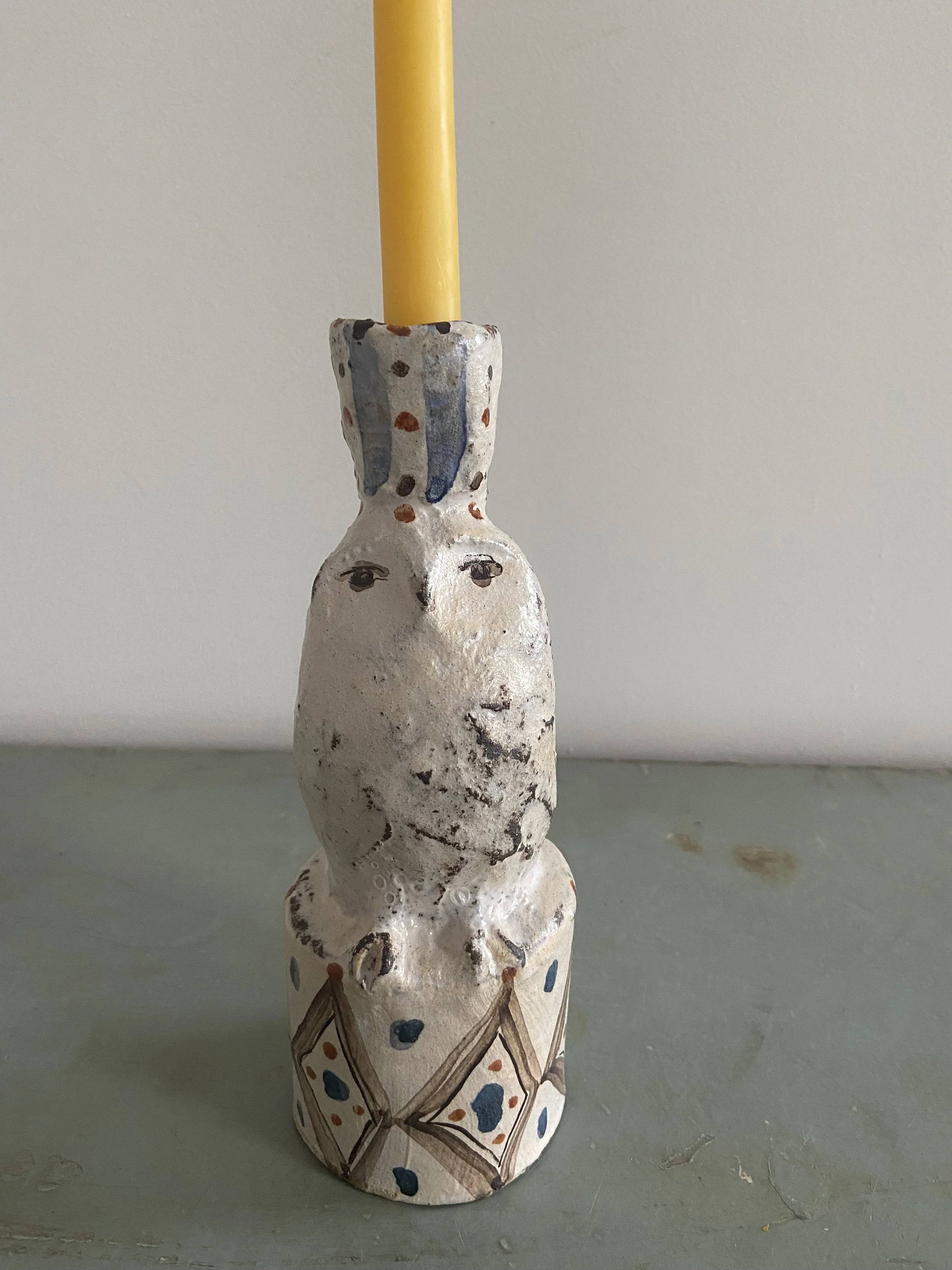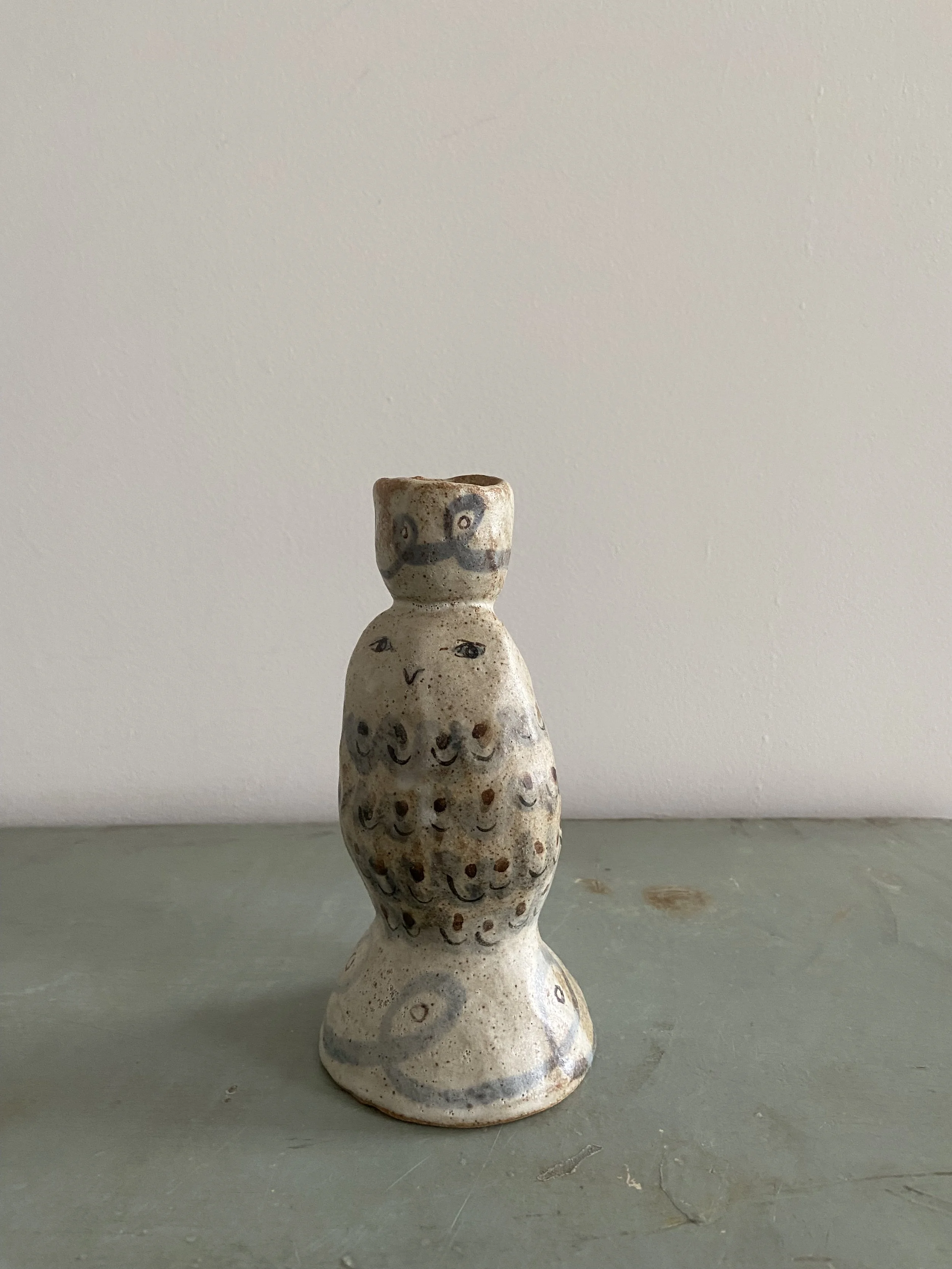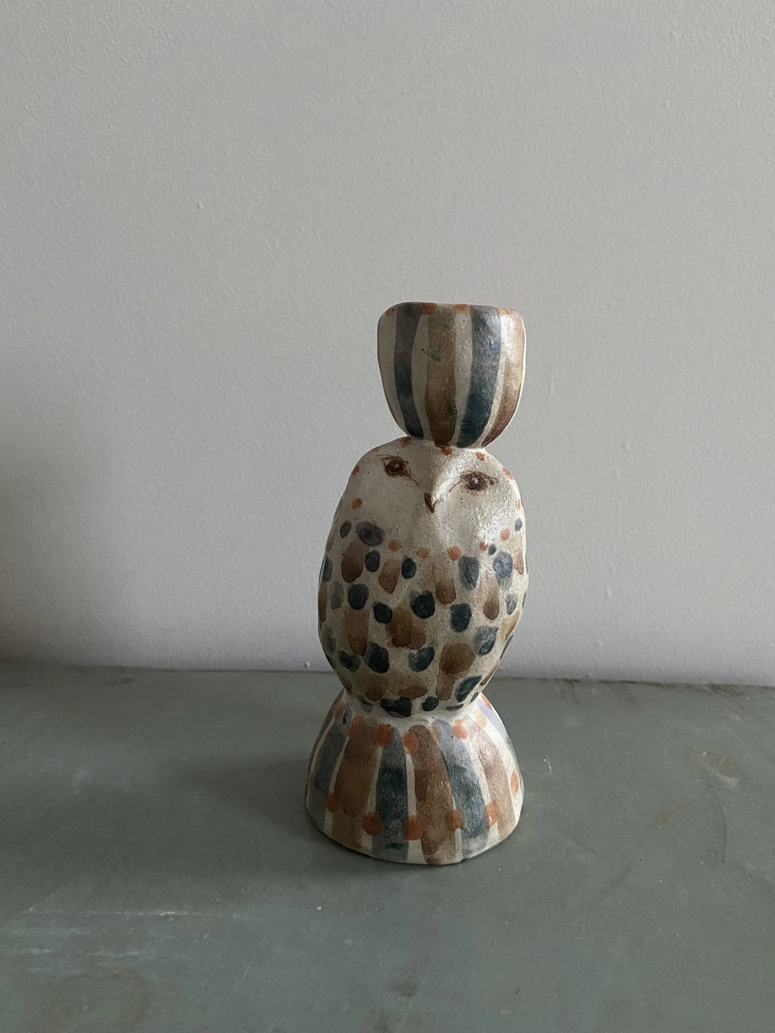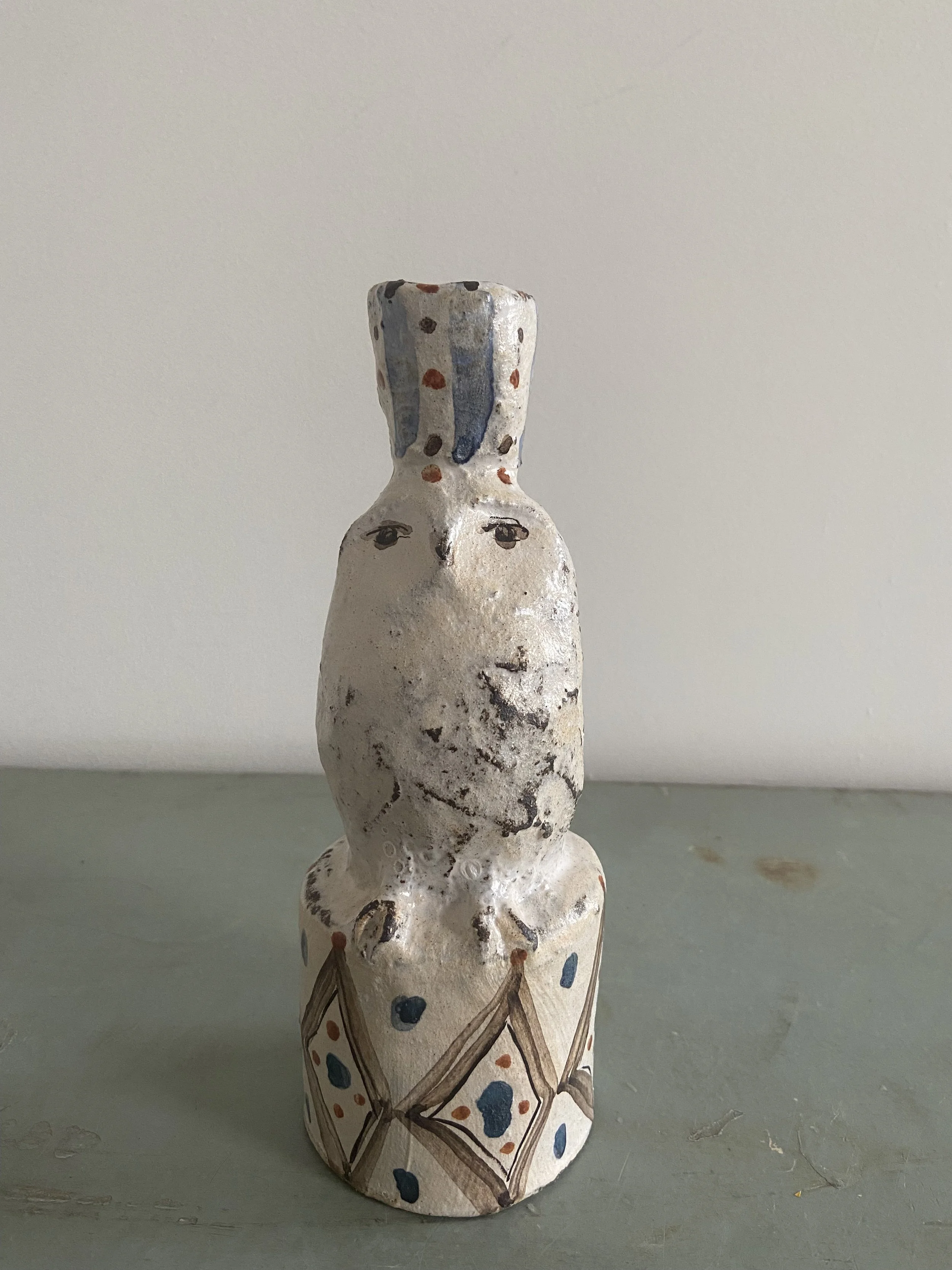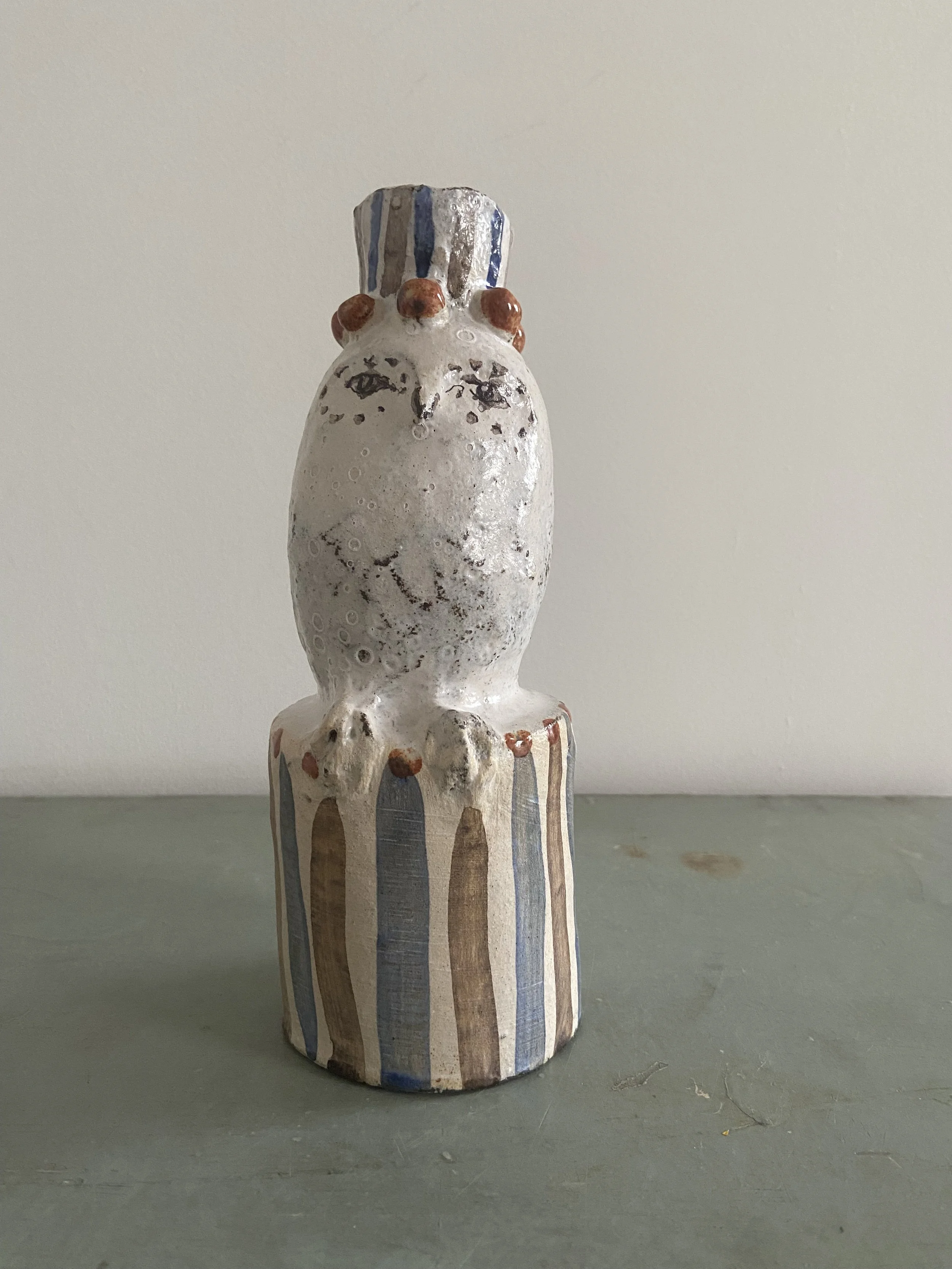 A characterful little owl ornament, handmade from buff stoneware, decorated with glaze and oxides. Fired twice in an electric kiln.