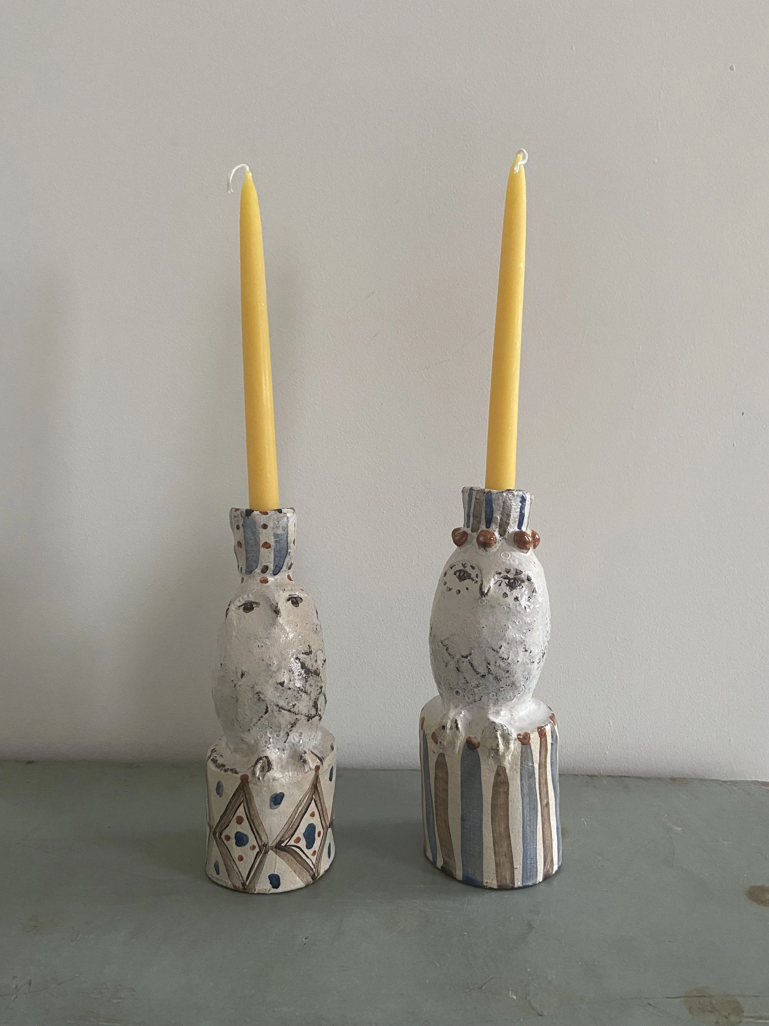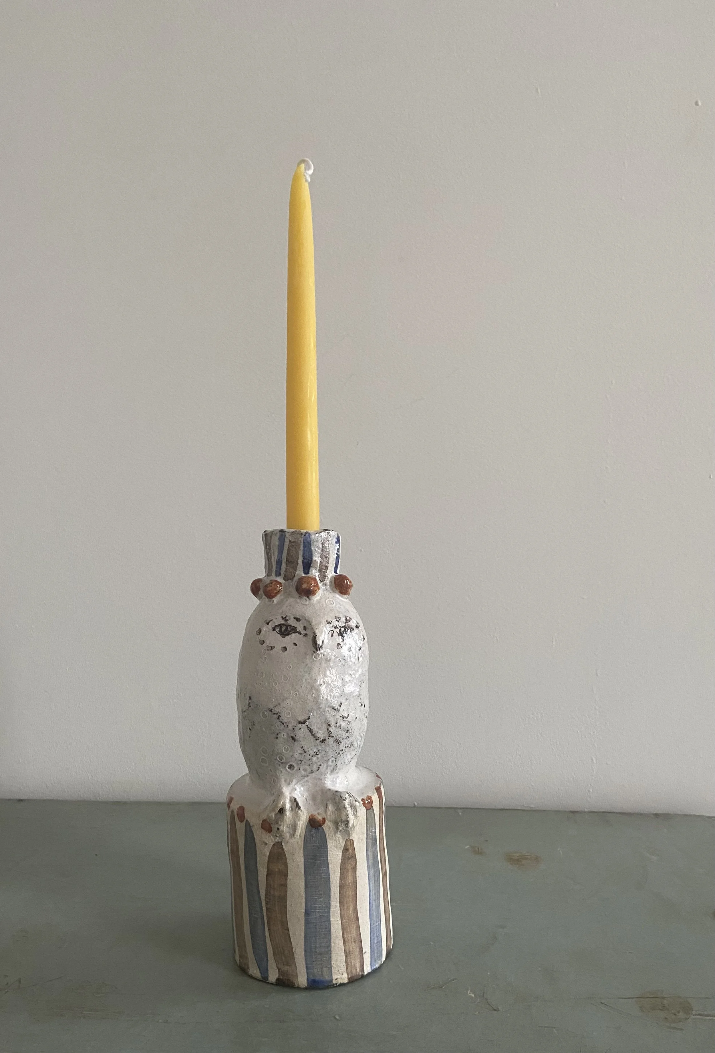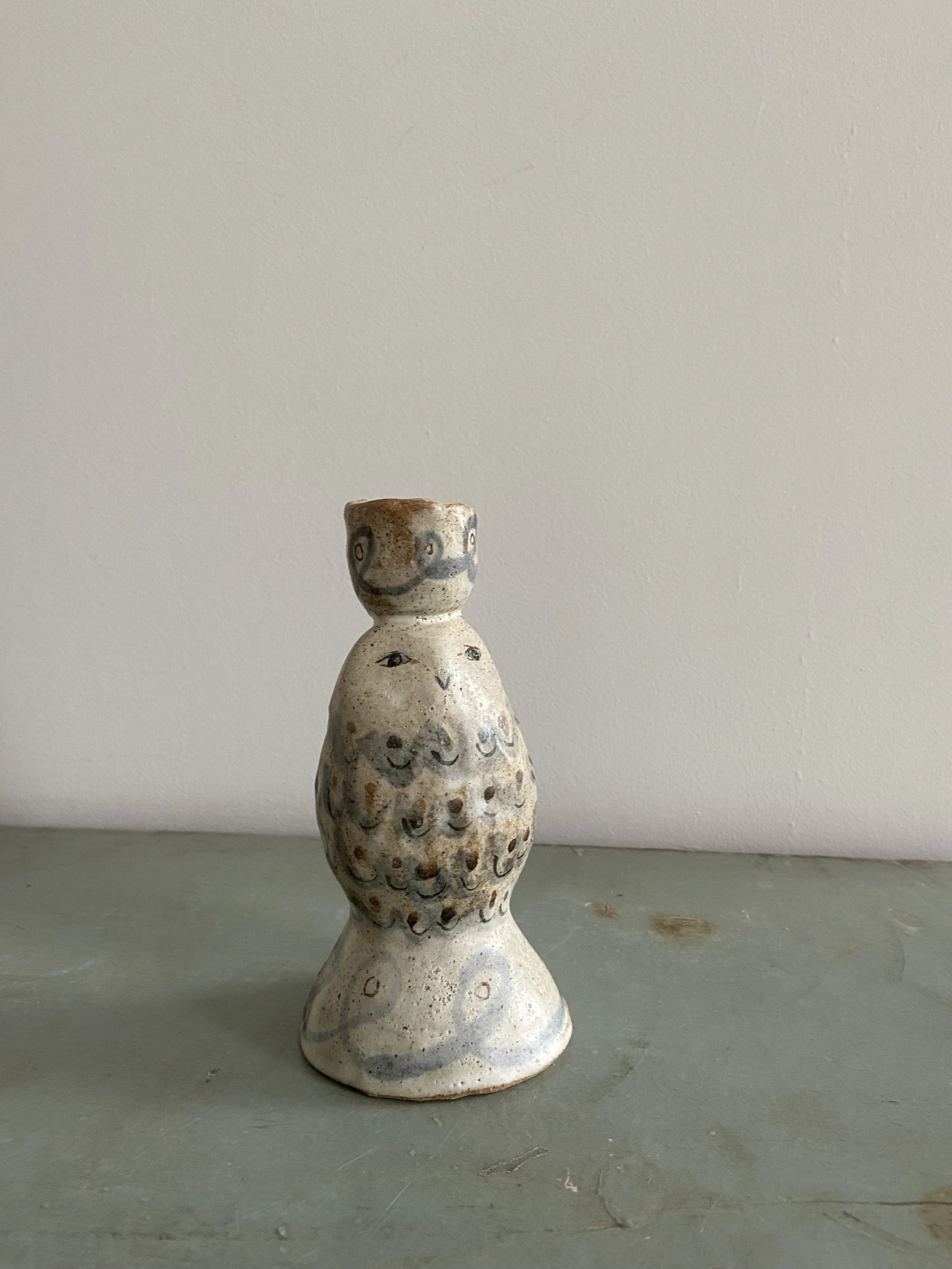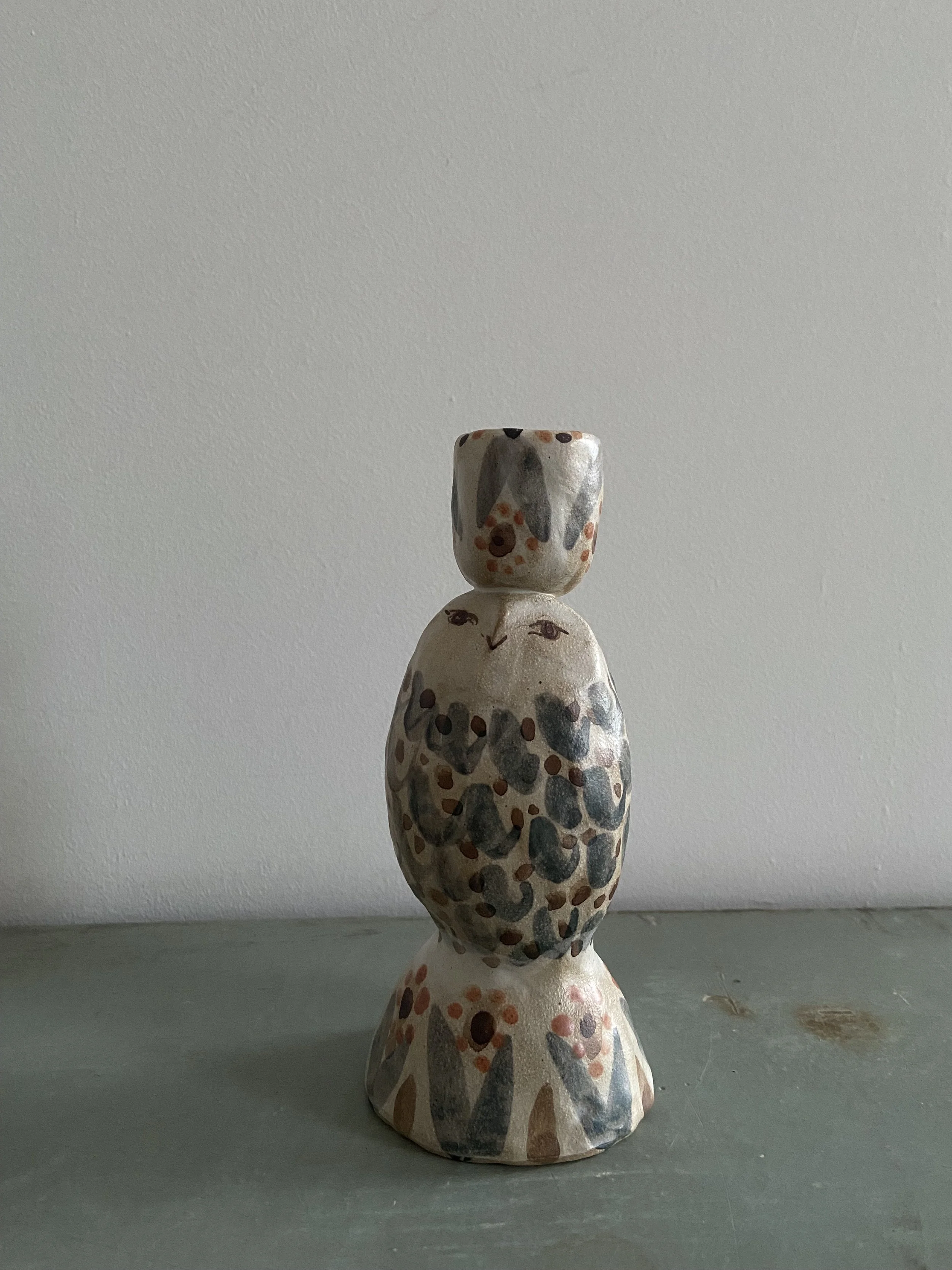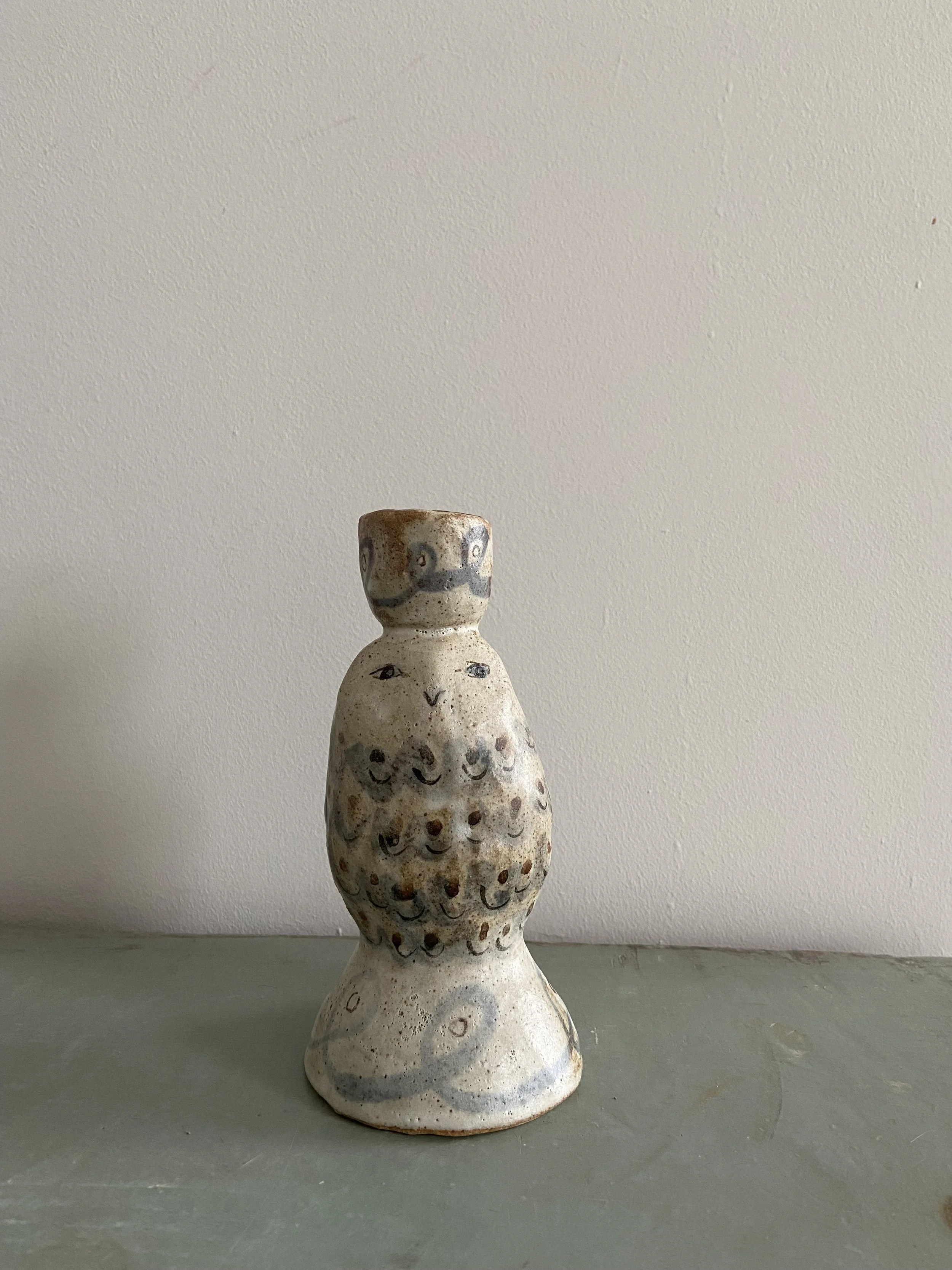 A characterful little owl ornament, handmade from buff stoneware, decorated with glaze and oxides. Fired twice in an electric kiln.