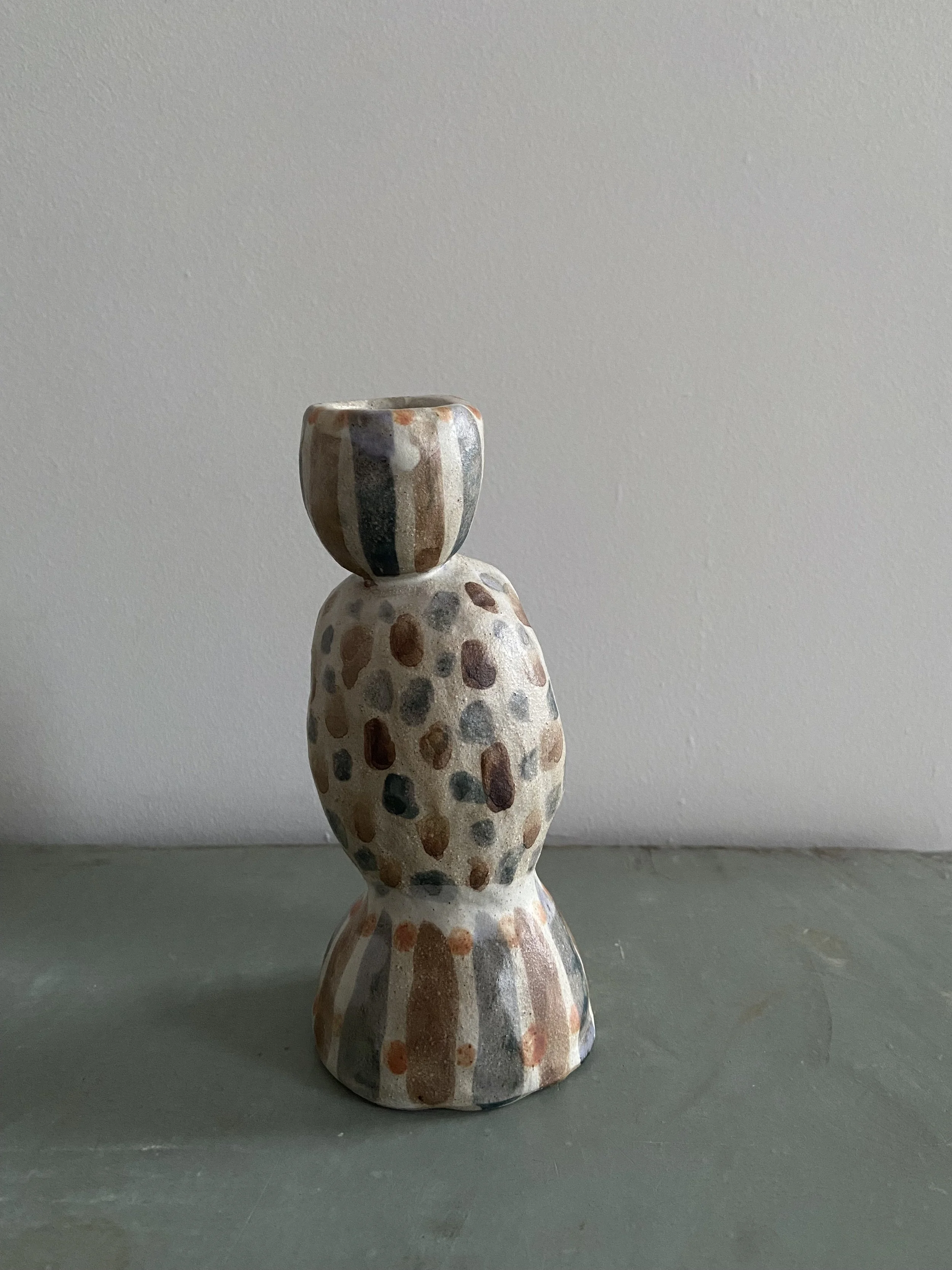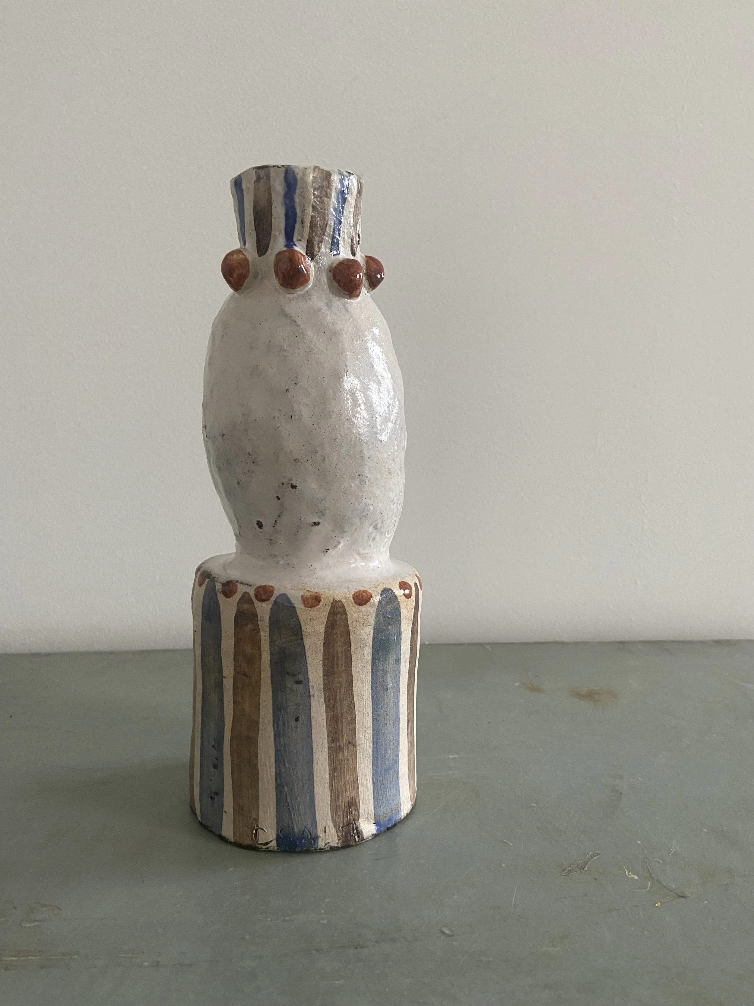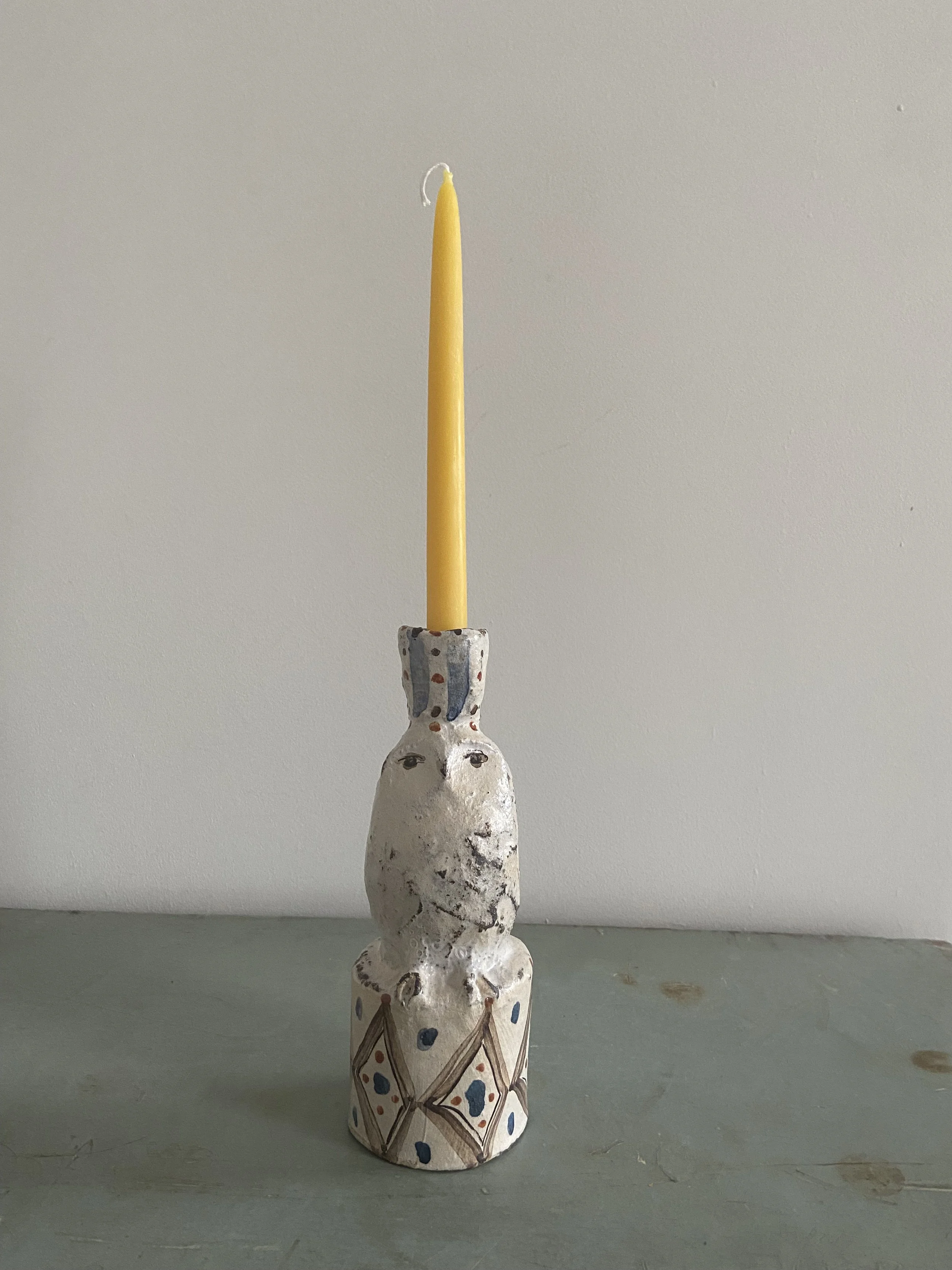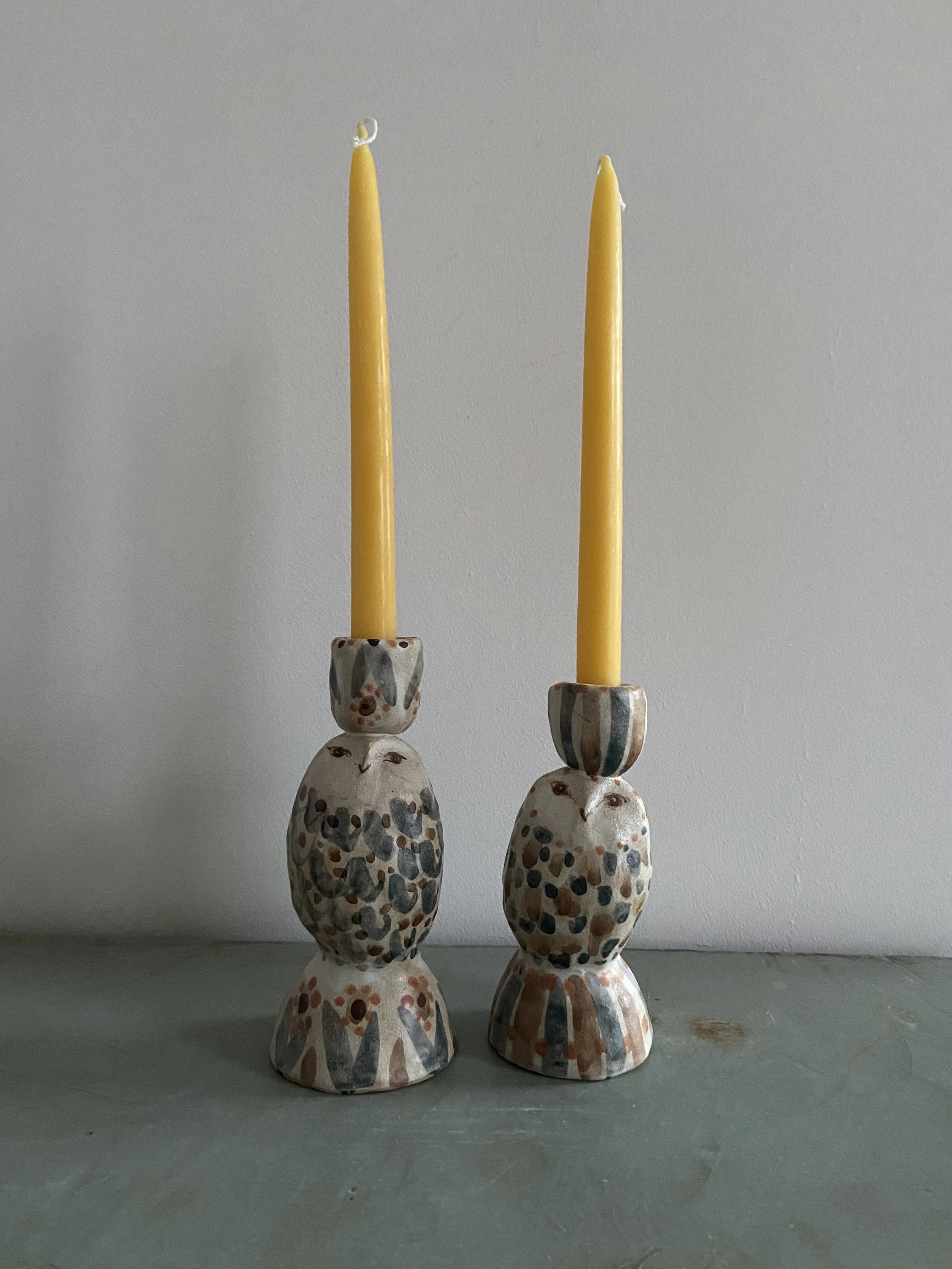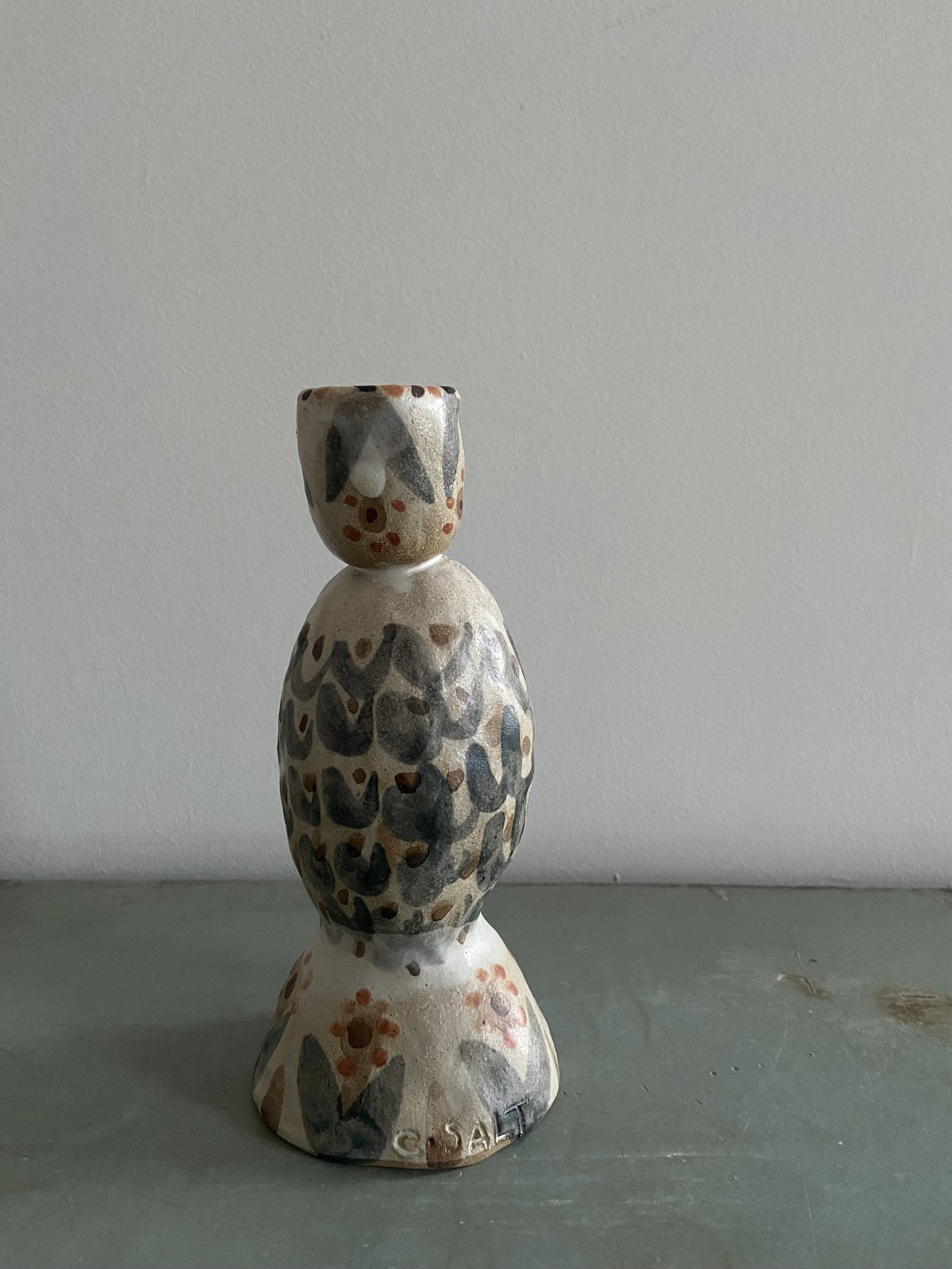 A characterful little owl ornament, handmade from buff stoneware, decorated with glaze and oxides. Fired twice in an electric kiln.