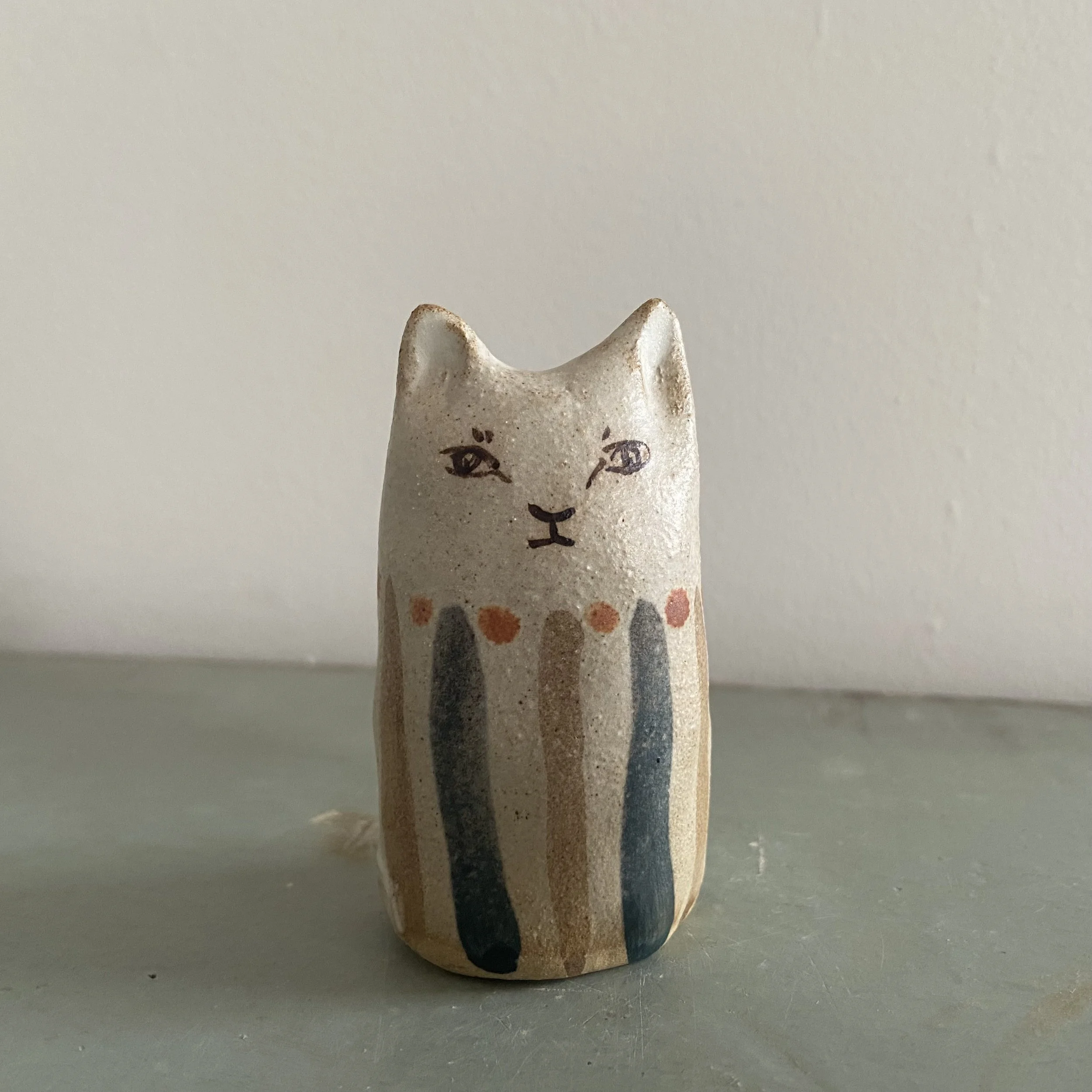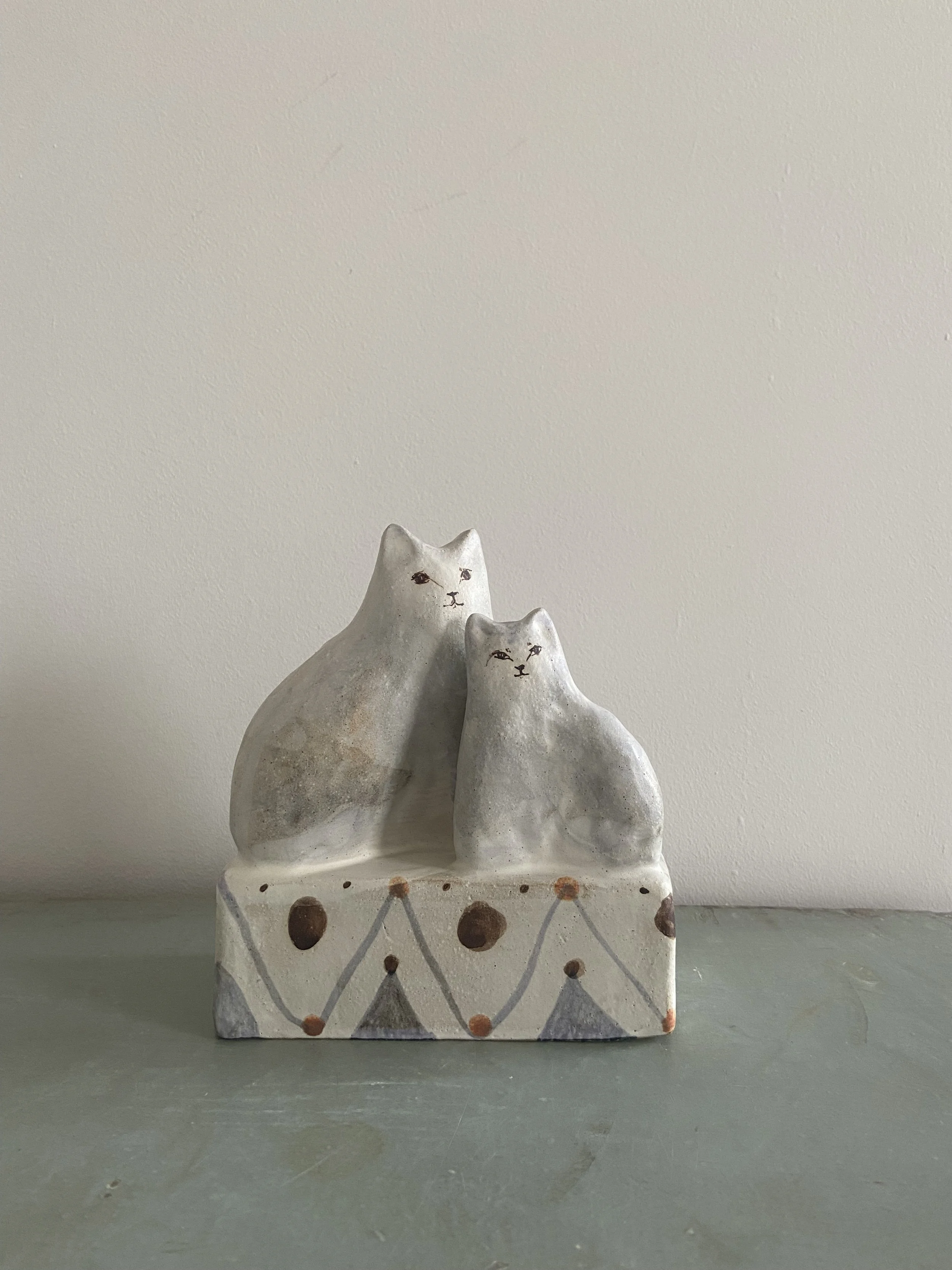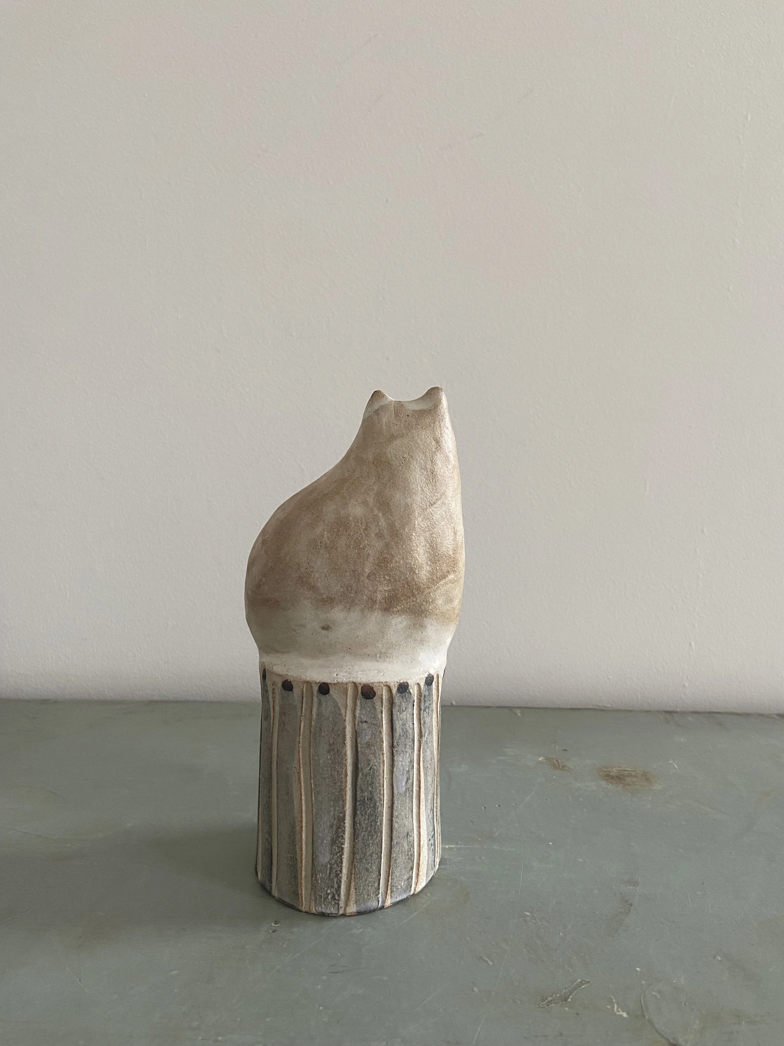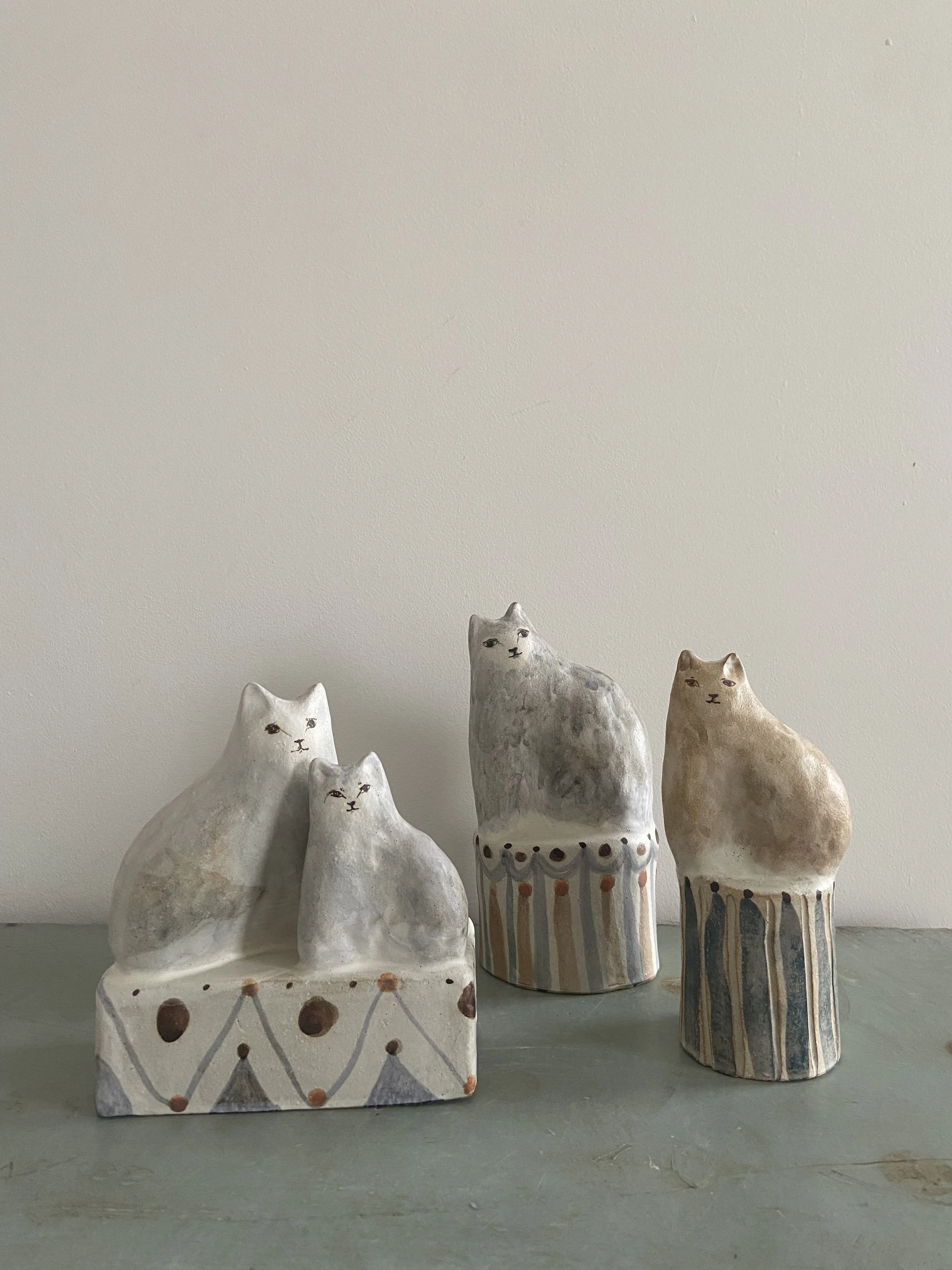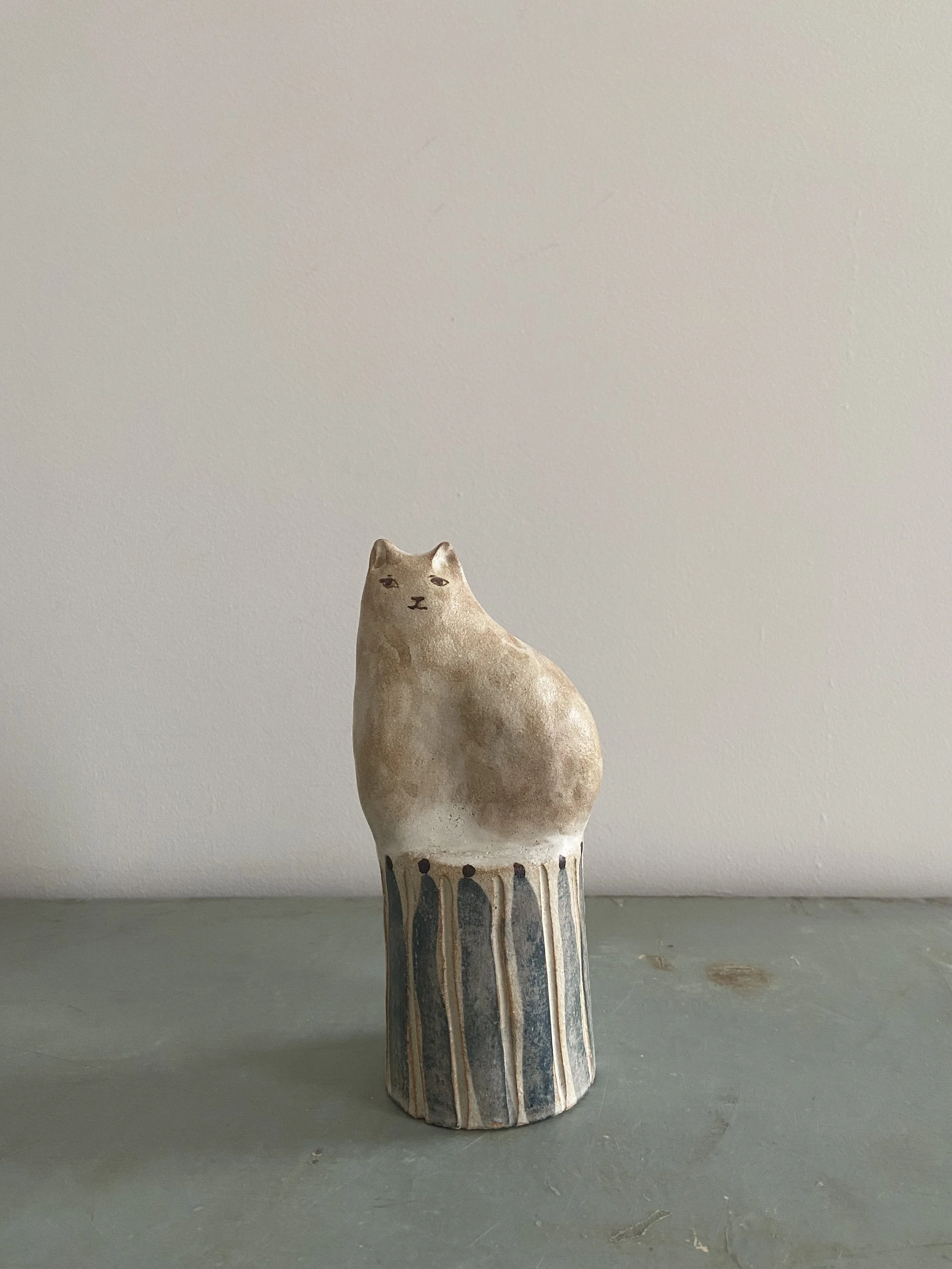 A characterful handmade ceramic cat perched on a patterned plinth, which has been made from stoneware clay. Decorated with glazes and oxides.