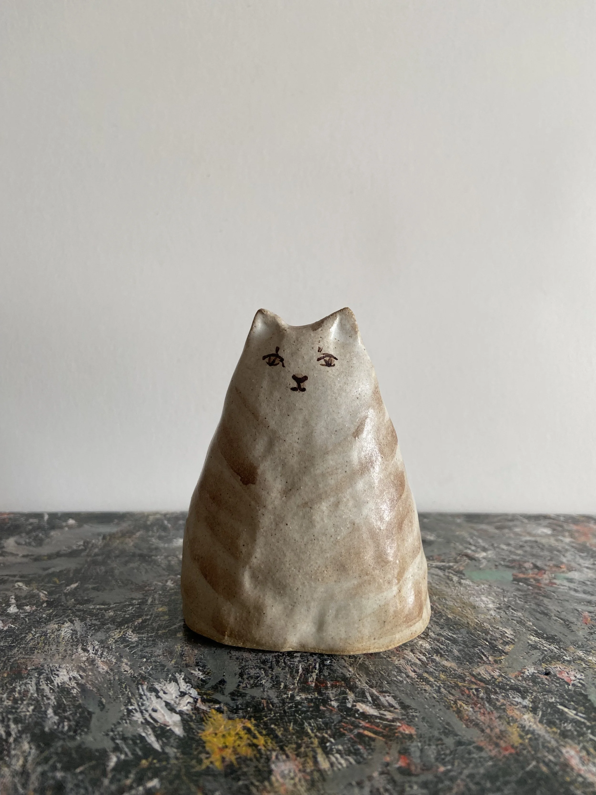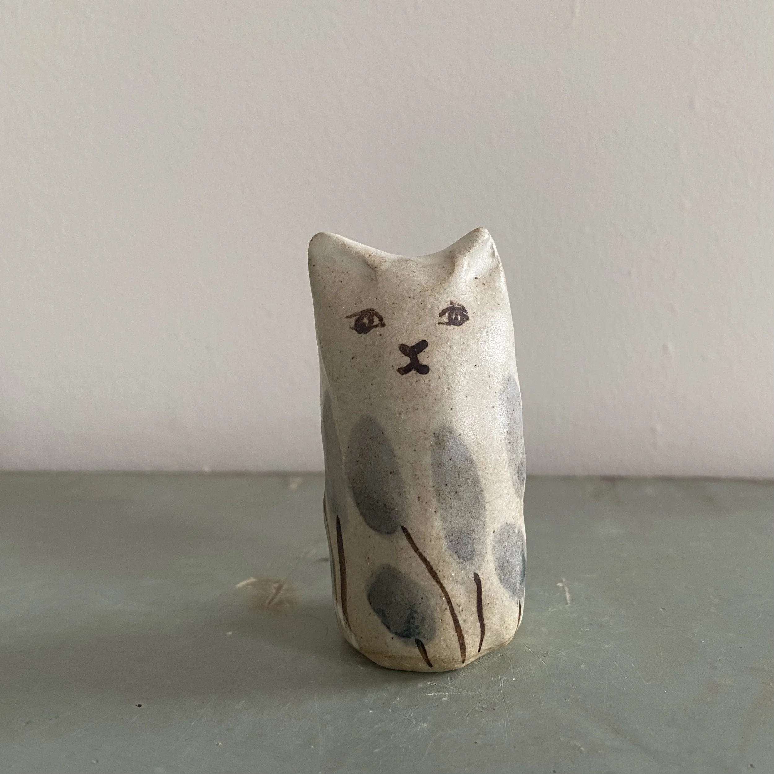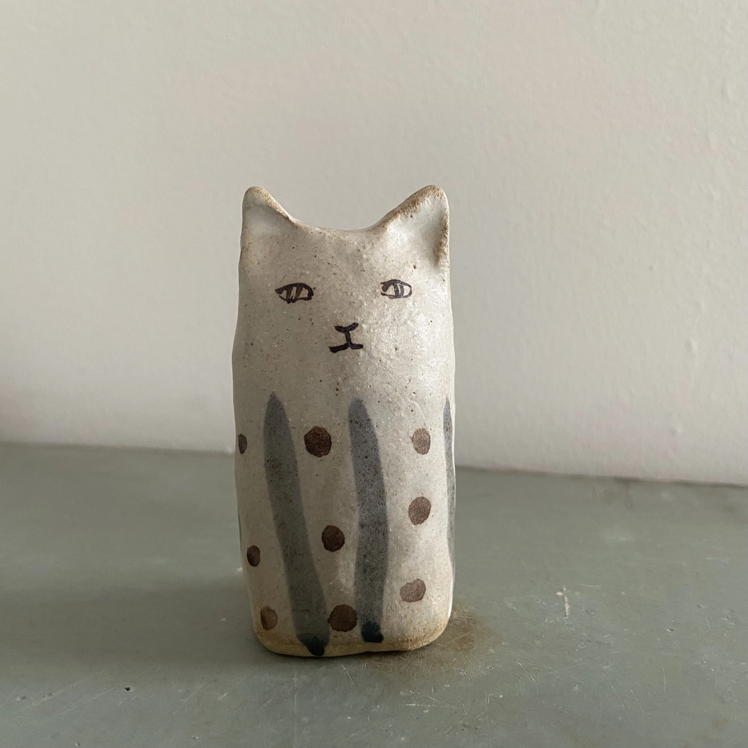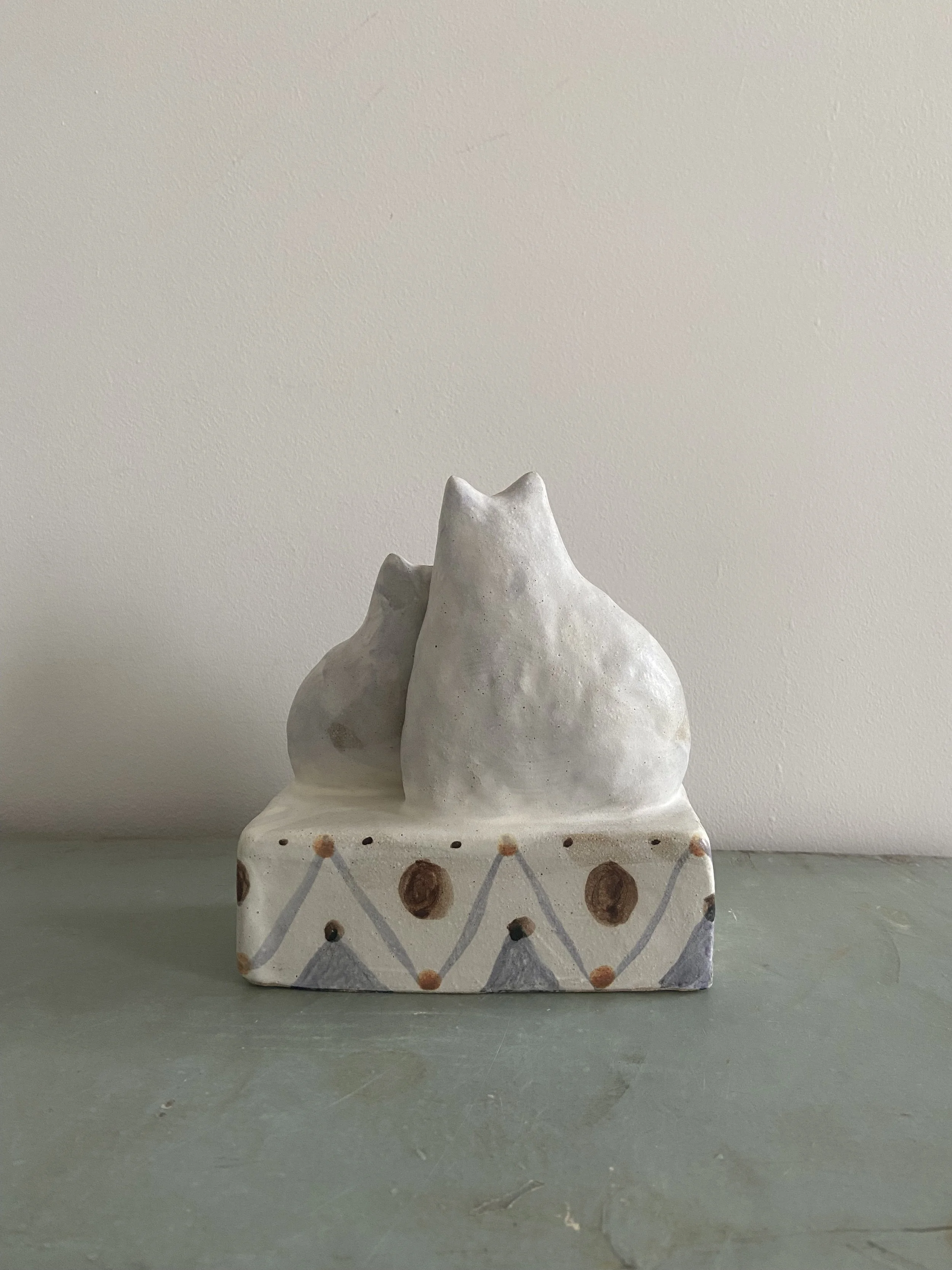 A characterful handmade ceramic cat perched on a patterned plinth, which has been made from stoneware clay. Decorated with glazes and oxides.