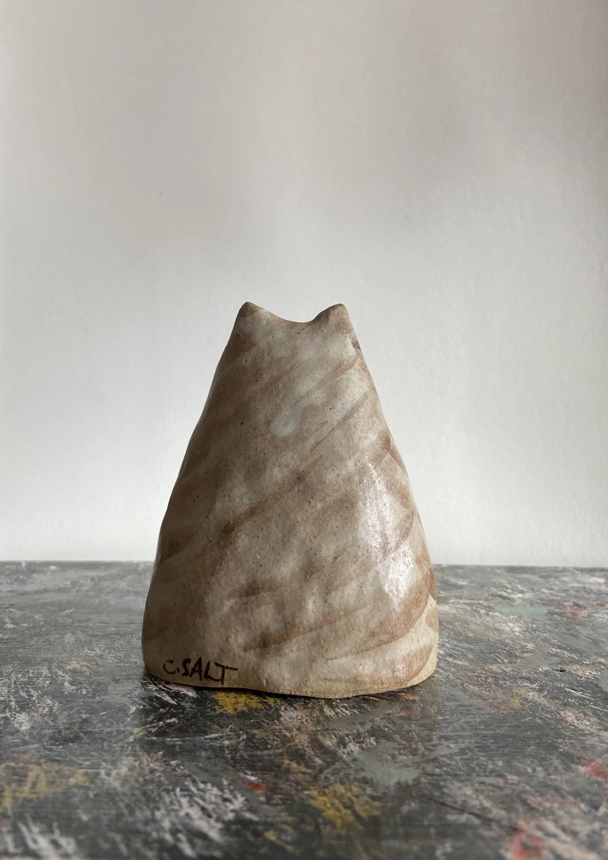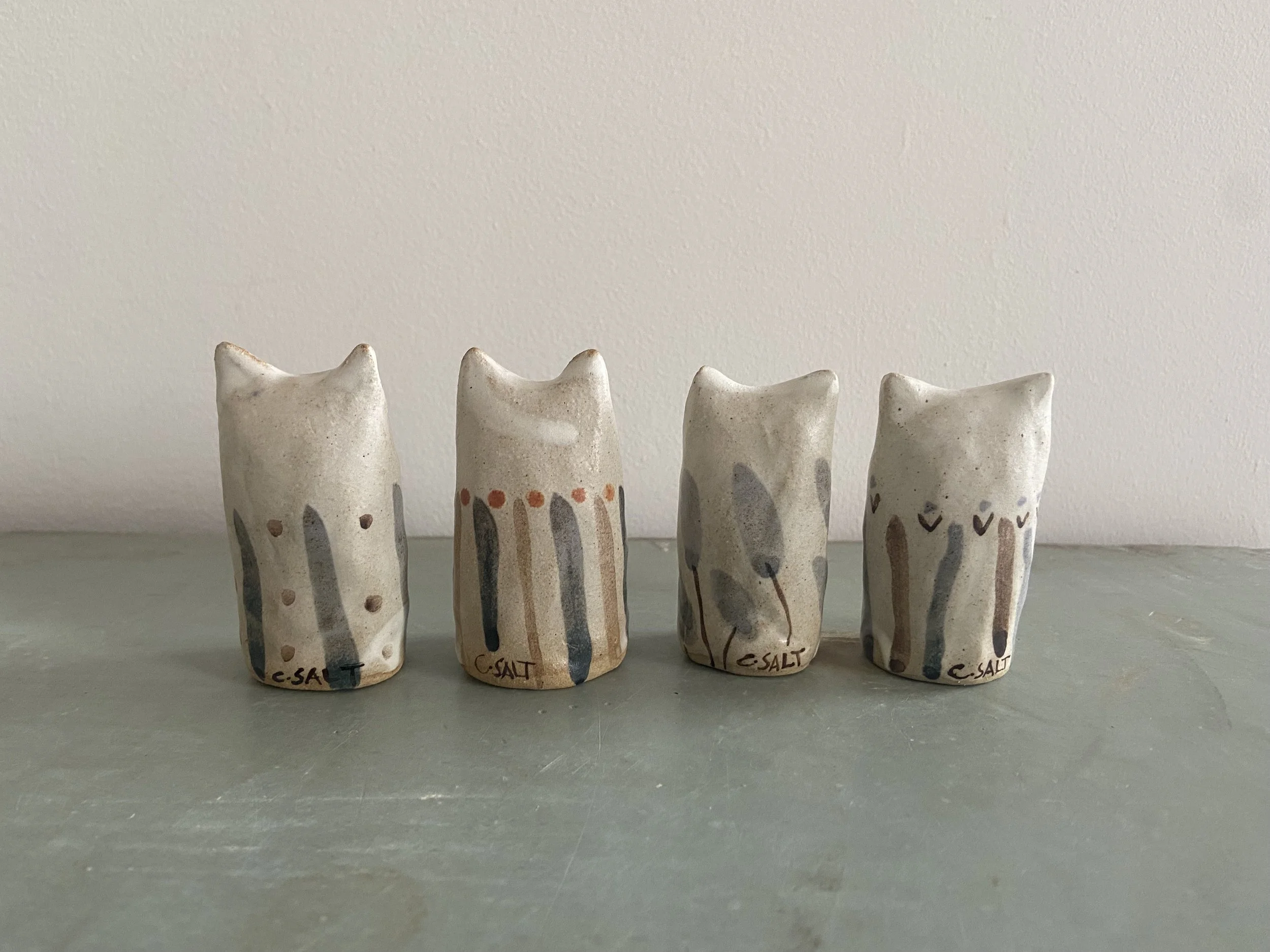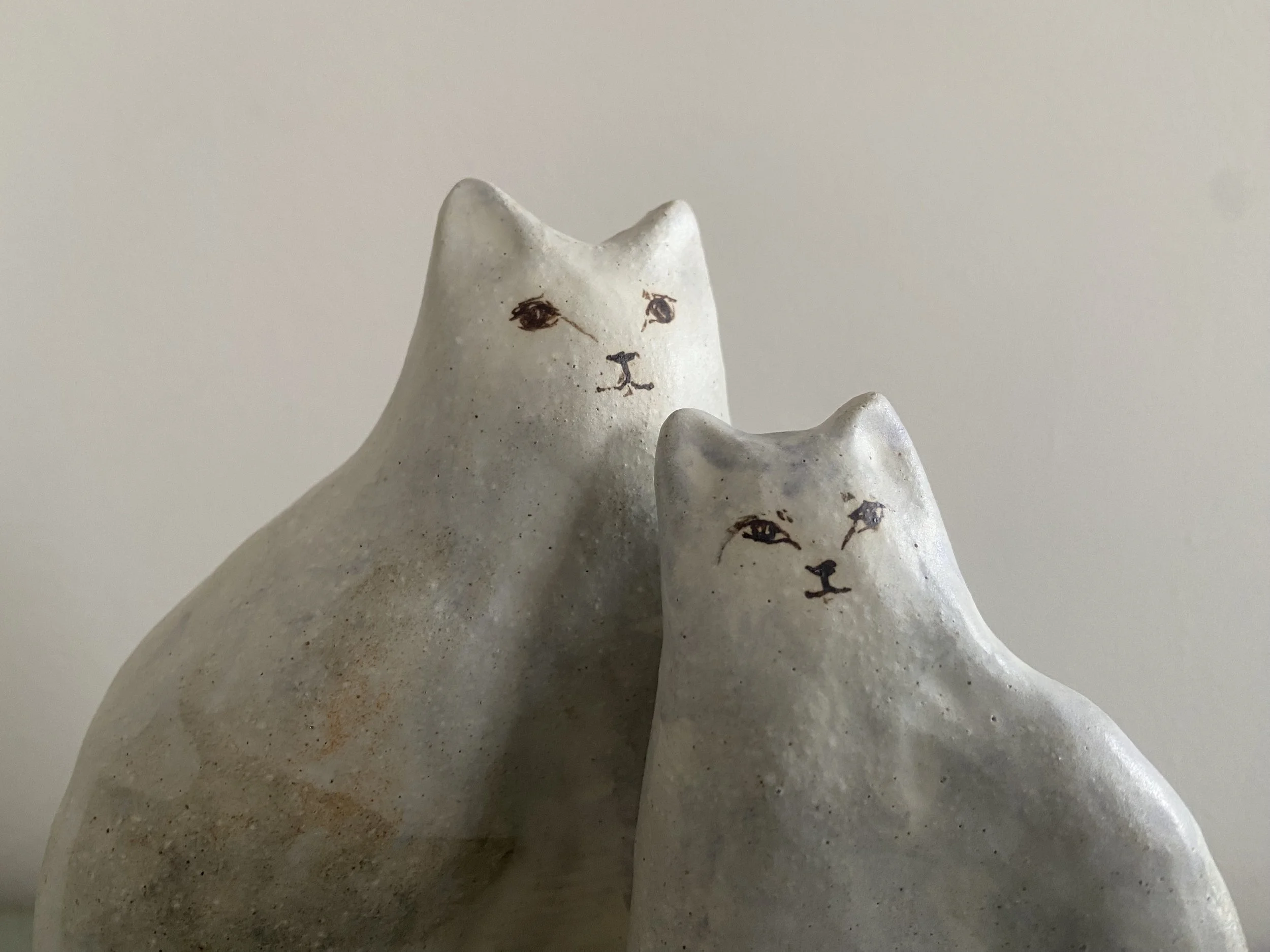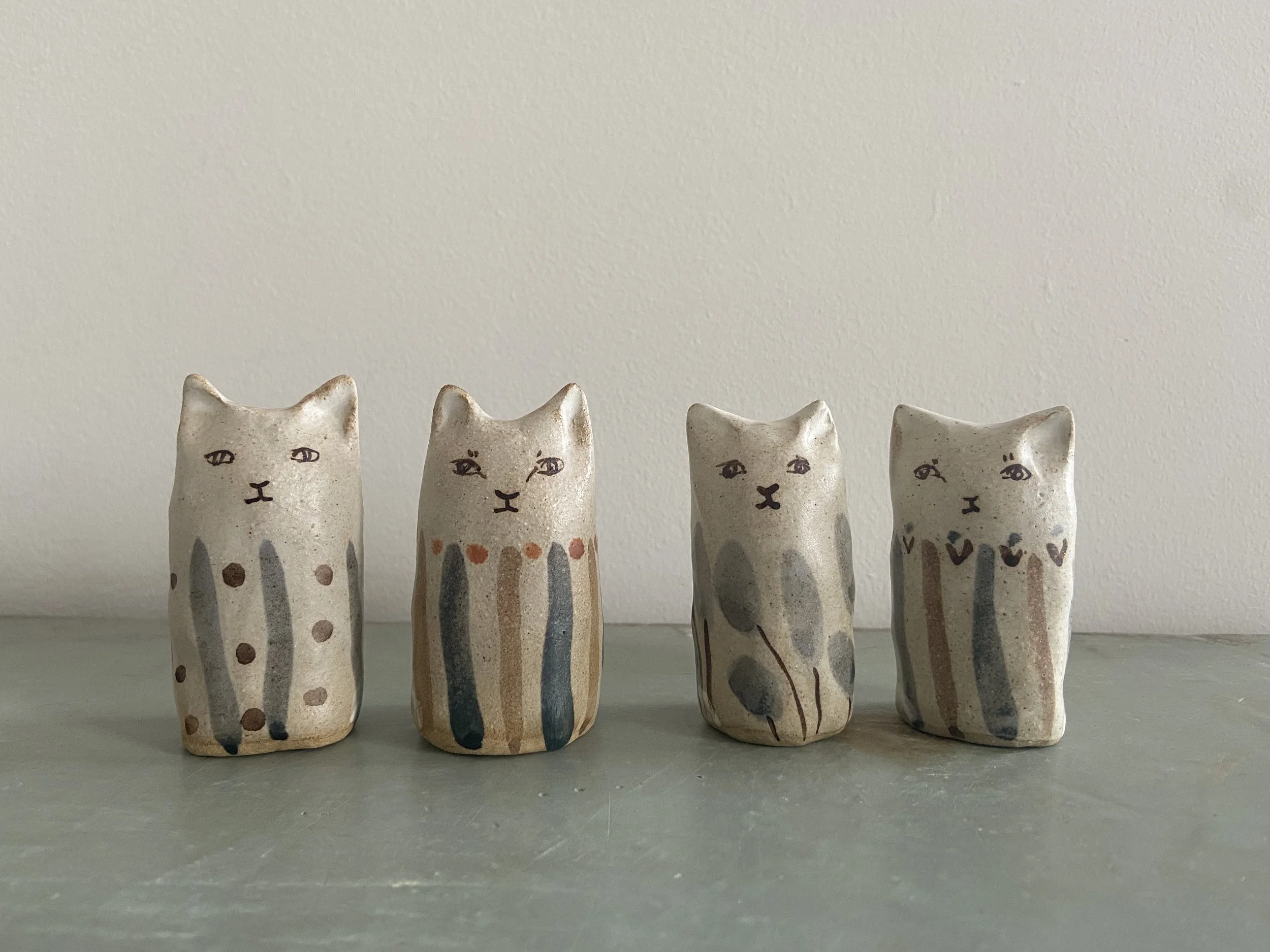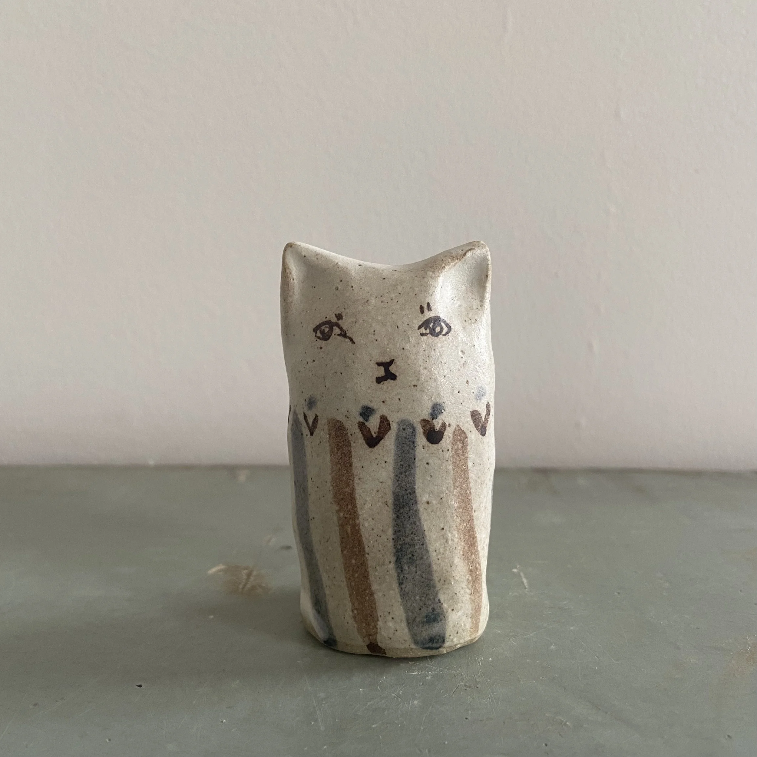 A characterful handmade ceramic cat perched on a patterned plinth, which has been made from stoneware clay. Decorated with glazes and oxides.
