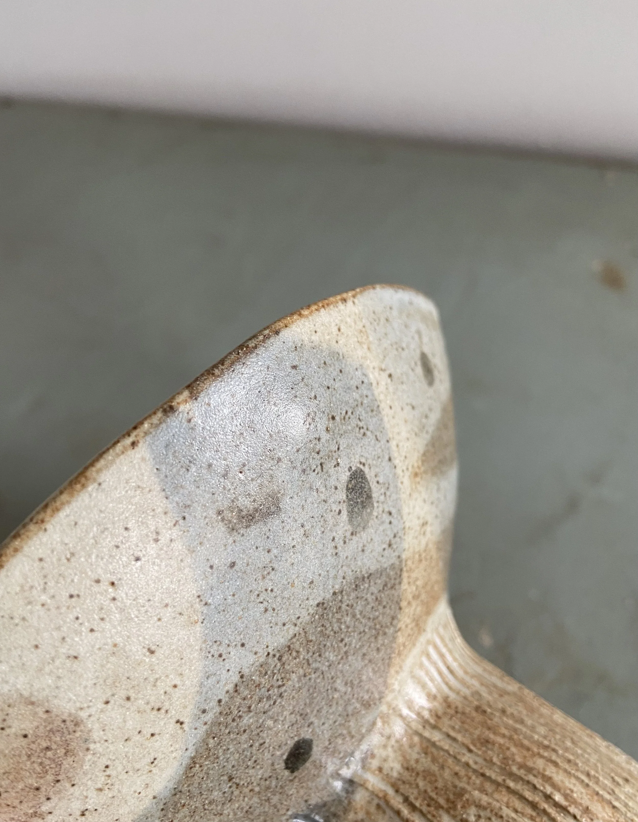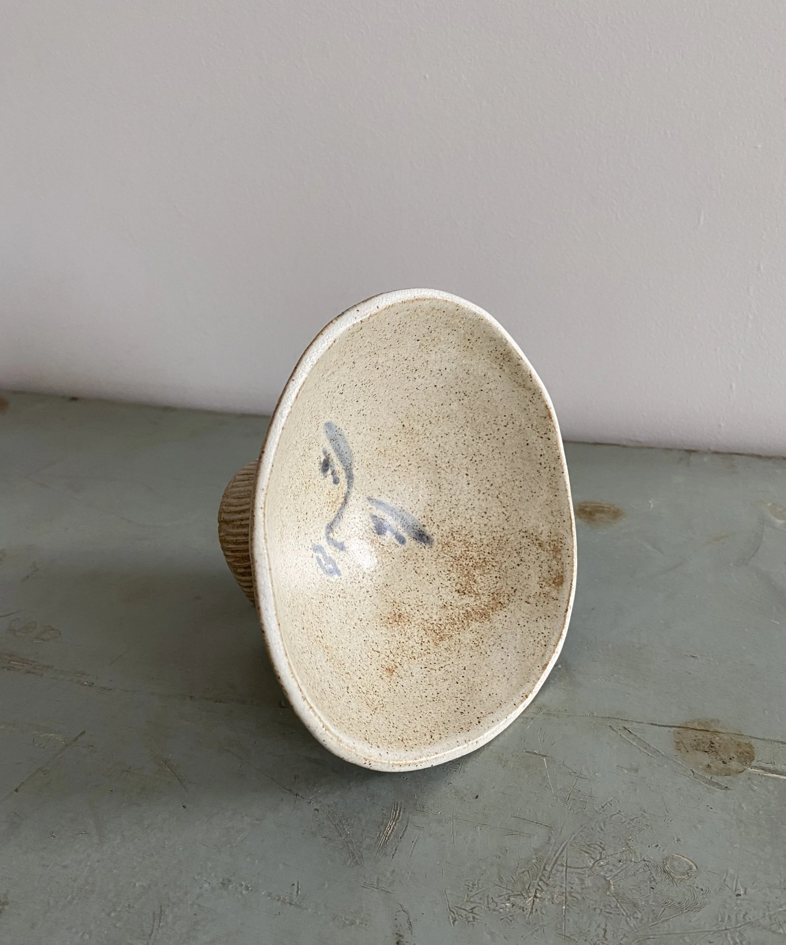 A handmade wavy edge bowl with bobble feet and a curios face. Made from buff stoneware clay, decorated with glaze and oxides.